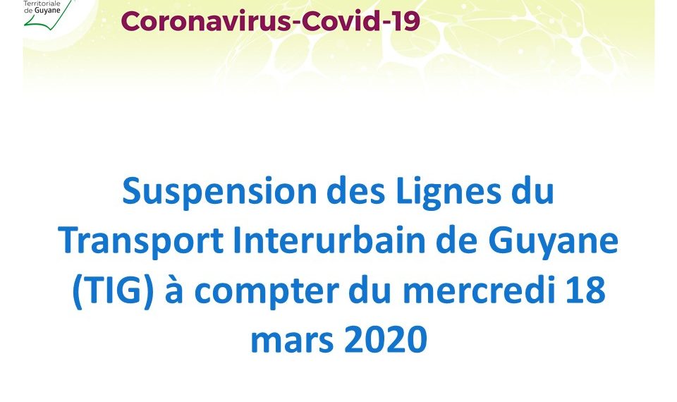 Dans le cadre des mesures de prévention liées à l’épidémie de coronavirus covid-19, la Collectivité Territoriale de Guyane (CTG), en concertation avec la préfecture de Guyane et les délégataires publics, suspend l’intégralité des lignes du Transport Interurbain de Guyane dès demain, mercredi 18 mars 2020, et ce jusqu’à nouvel ordre.