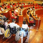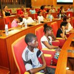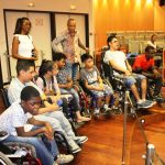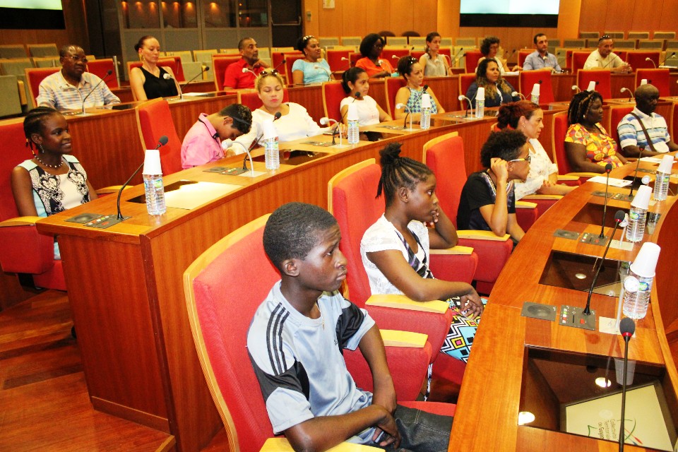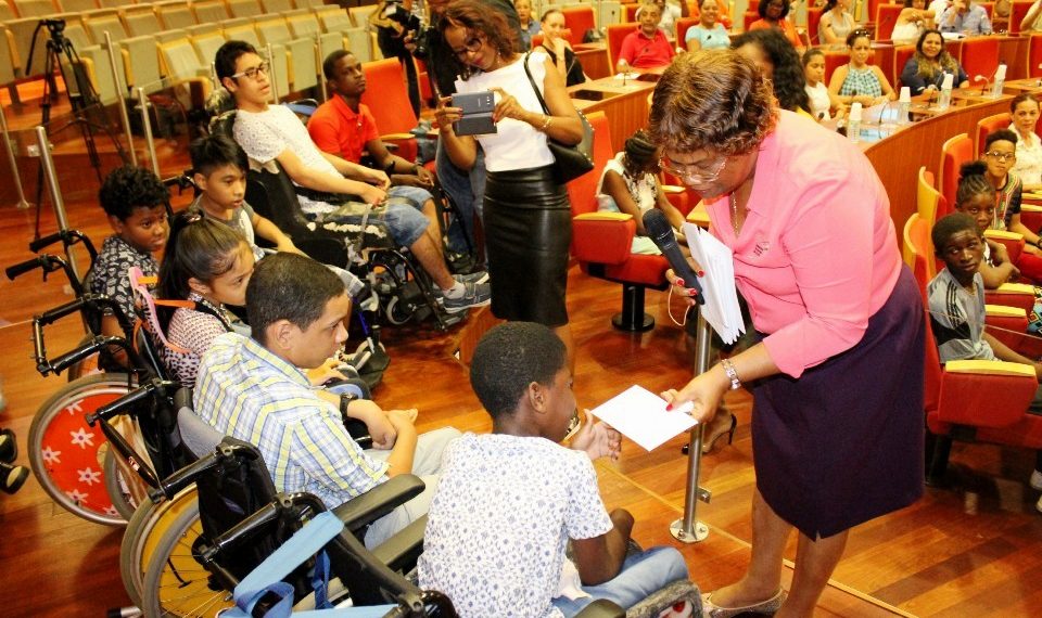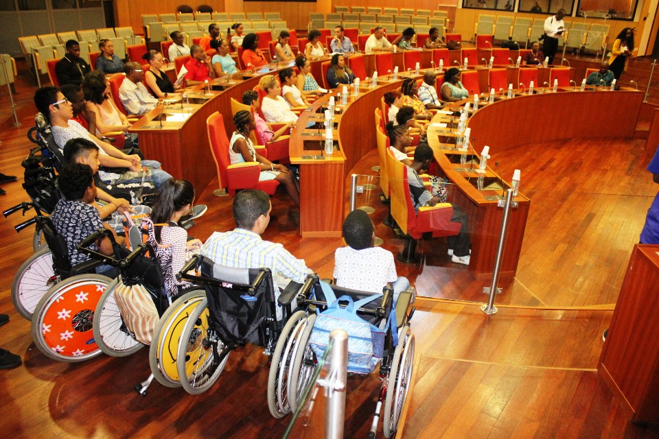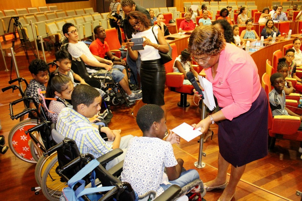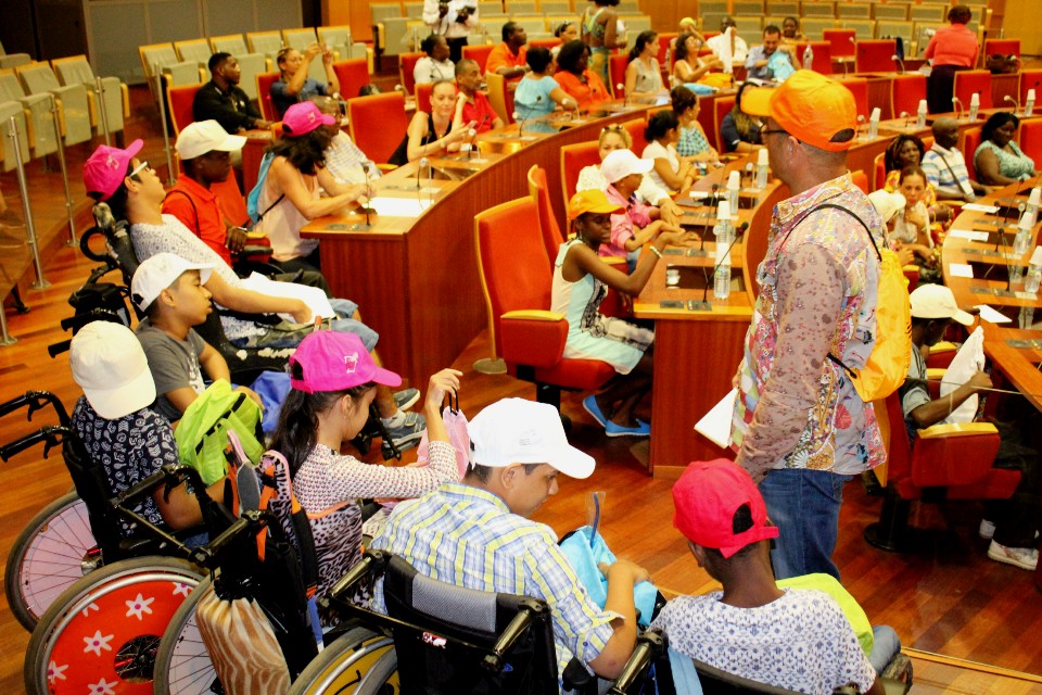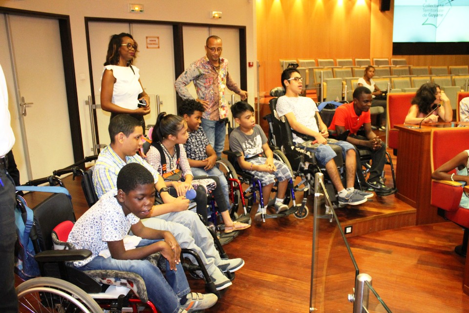 Dans le cadre d’un projet de voyage en Guadeloupe, une délégation de 14 jeunes en situation de handicap moteur encadrée par une équipe pluridisciplinaire de l’Association départementale Les pupilles de l’enseignement public de Guyane (ADPEP), notamment ceux de l’IEM (Institut d’Education Motrice), a été reçue ce mercredi 14 juin 2017 par le président de la Collectivité Territoriale de Guyane, Rodolphe Alexandre. Cette rencontre organisée dans la salle des délibérations de l’hôtel territorial a eu pour objectif d’encourager les équipes encadrant ces jeunes en situation de handicap et de leur permettre de concrétiser ce projet de voyage.
