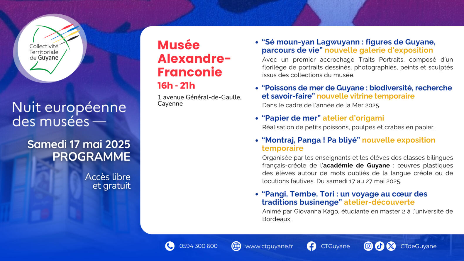 Initiée et coordonnée depuis plus de 20 ans par le ministère de la Culture, la Nuit européenne des musées revient pour sa 21e édition, le samedi 17 mai 2025. À cette occasion, la Collectivité Territoriale de Guyane proposera une programmation riche au public.