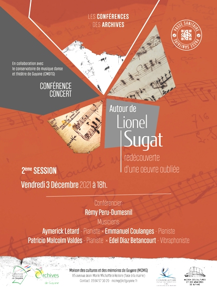 Ce vendredi 3 décembre 2021, les partitions seront, pour la seconde fois, jouées en public par des professeurs du Conservatoire de Musique Danse et Théâtre de Guyane (CMDTG) lors d’une Conférence Concert. Une première présentation de ces œuvres avait eu lieu le jeudi 8 juillet 2021 : face au succès de cette première édition, l’organisation d’un second concert avait été actée dès que les conditions sanitaires seraient plus favorables. Cette action vise donc à restituer l’œuvre de Lionel Sugat au grand public ainsi qu’aux musiciens et chercheurs.