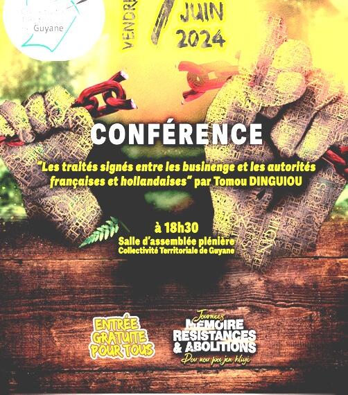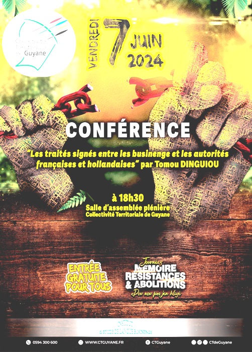 Dans le cadre de la programmation des Journées Mémoires Résistances et Abolition, la Collectivité Territoriale de Guyane (CTG) propose une conférence intitulée « Les traités signés entre les businenge et les autorités françaises et hollandaises », animée par Tomou Dinguiou, Chercheur et enseignant, spécialisé en linguistique Businenge Tongo, le vendredi 07 juin 2024 à 18h30 dans la salle des délibérations de l’Hôtel territorial à Cayenne.