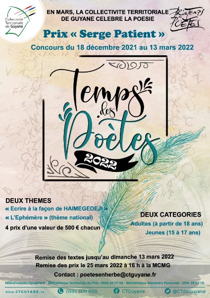 Dans le cadre du ” Printemps des Poètes”, manifestation nationale et internationale annuelle ayant pour vocation de sensibiliser la population à la poésie sous toutes ses formes, la Collectivité Territoriale de Guyane propose chaque année, depuis 2018, un concours de poésie désormais intitulé « Prix de la Poésie Serge Patient ».