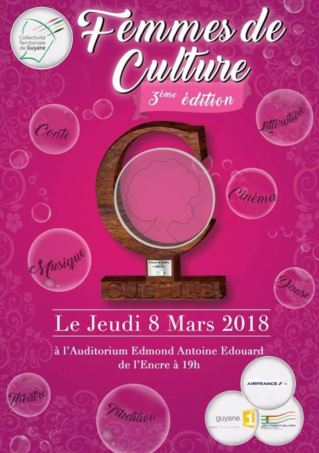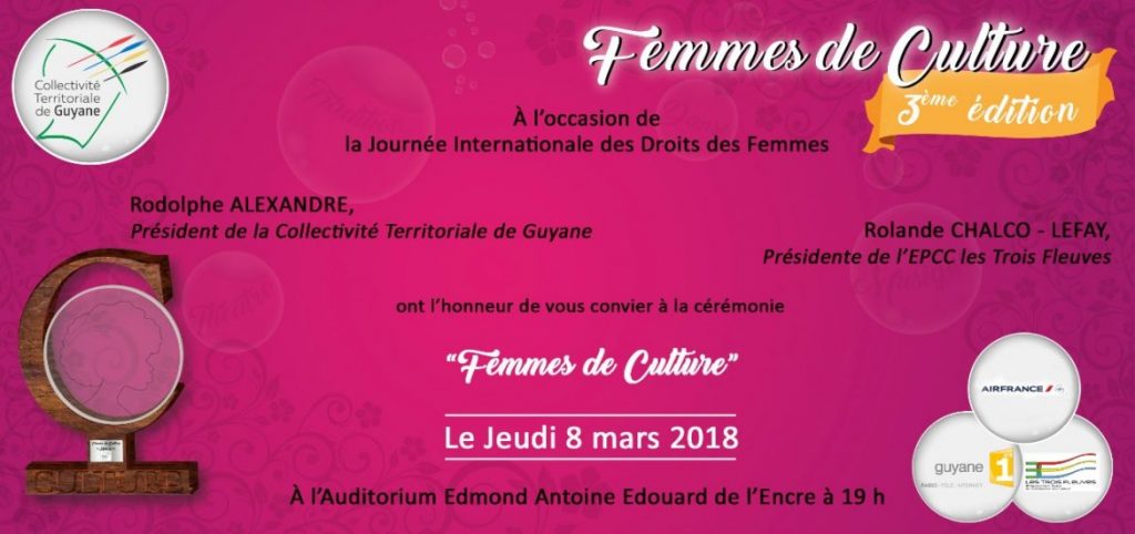 Dans le cadre de la journée internationale de la femme, une cérémonie dédiée sera organisée ce jeudi 8 mars 2018 à l’ENCRE par la CTG en partenariat avec Guyane la 1ère, Air France et l’EPCC les 3 fleuves, afin de saluer le talent et l’engagement de nos artistes féminines.