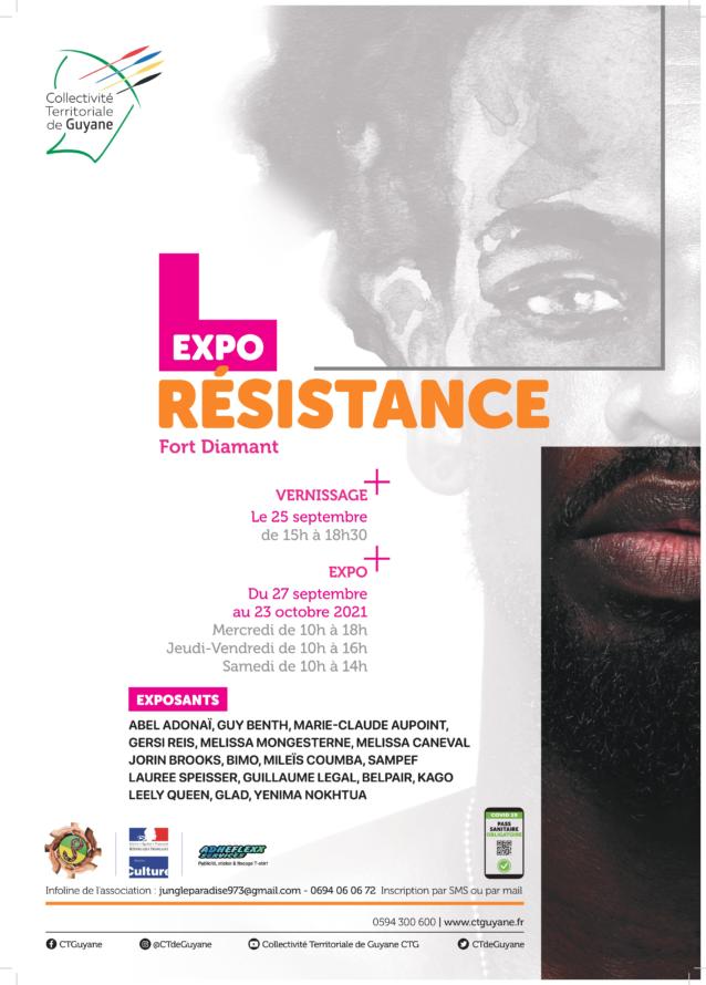 Le Fort diamant à Rémire-Montjoly accueille du 27 septembre au 23 octobre 2021, l’exposition “Résistance”, organisée à l’initiative de l’association Jungle Paradise, en partenariat avec la Collectivité Territoriale de Guyane (CTG) et dans le cadre du vingtième anniversaire de la Loi du 21 mai 2001, relative à la reconnaissance de la traite et de l’esclavage en tant que crime contre l’humanité, plus connue sous le nom de loi Taubira.