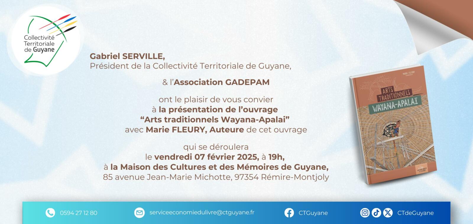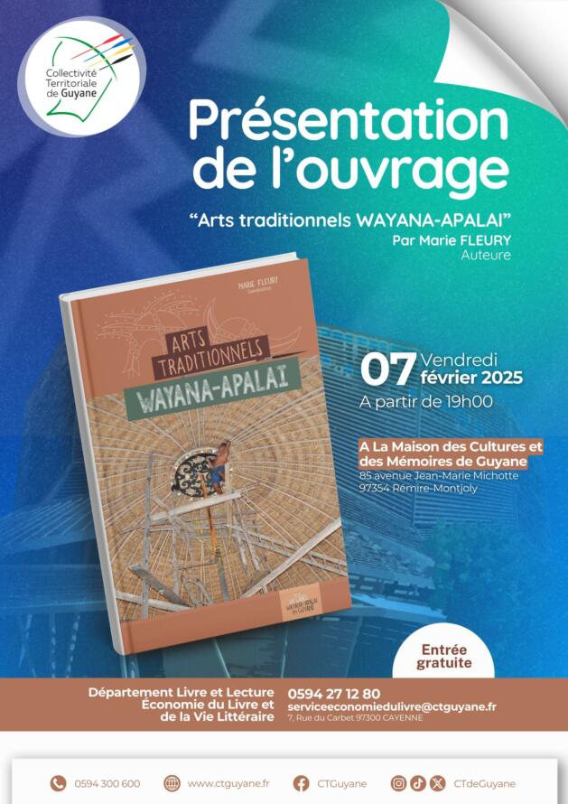 Dans le cadre de sa politique de soutien aux auteurs et à l’économie du livre, la Collectivité Territoriale de Guyane (CTG) a accompagné la publication de l’ouvrage « Arts traditionnels : Wayana-Apalai » écrit par Marie Fleury. Ce livre met en lumière la richesse des savoir-faire et des expressions artistiques des peuples autochtones Wayana et Apalaï de Guyane.