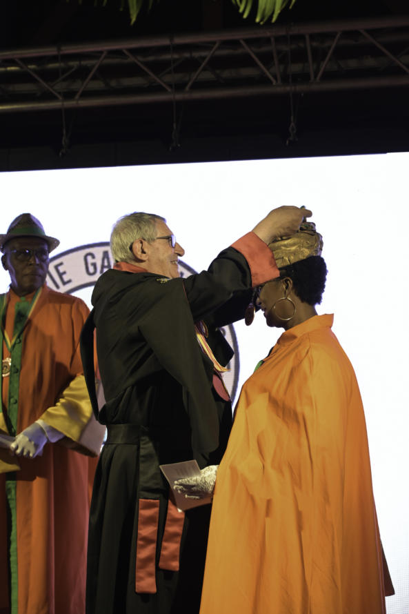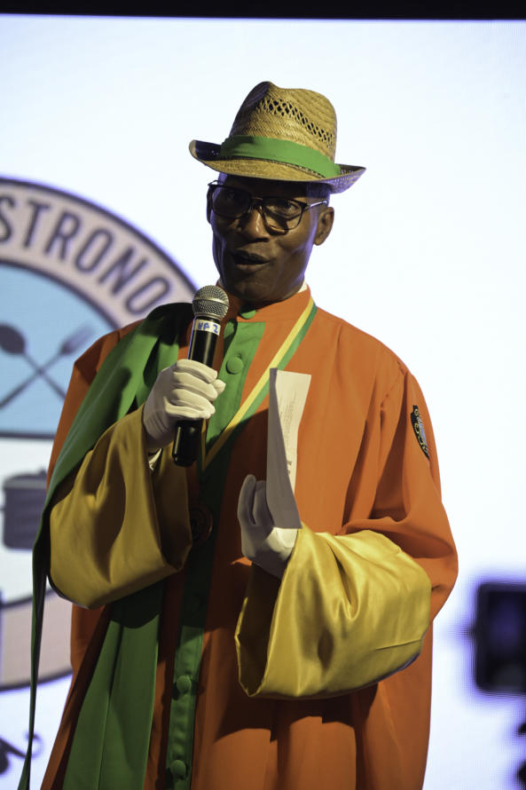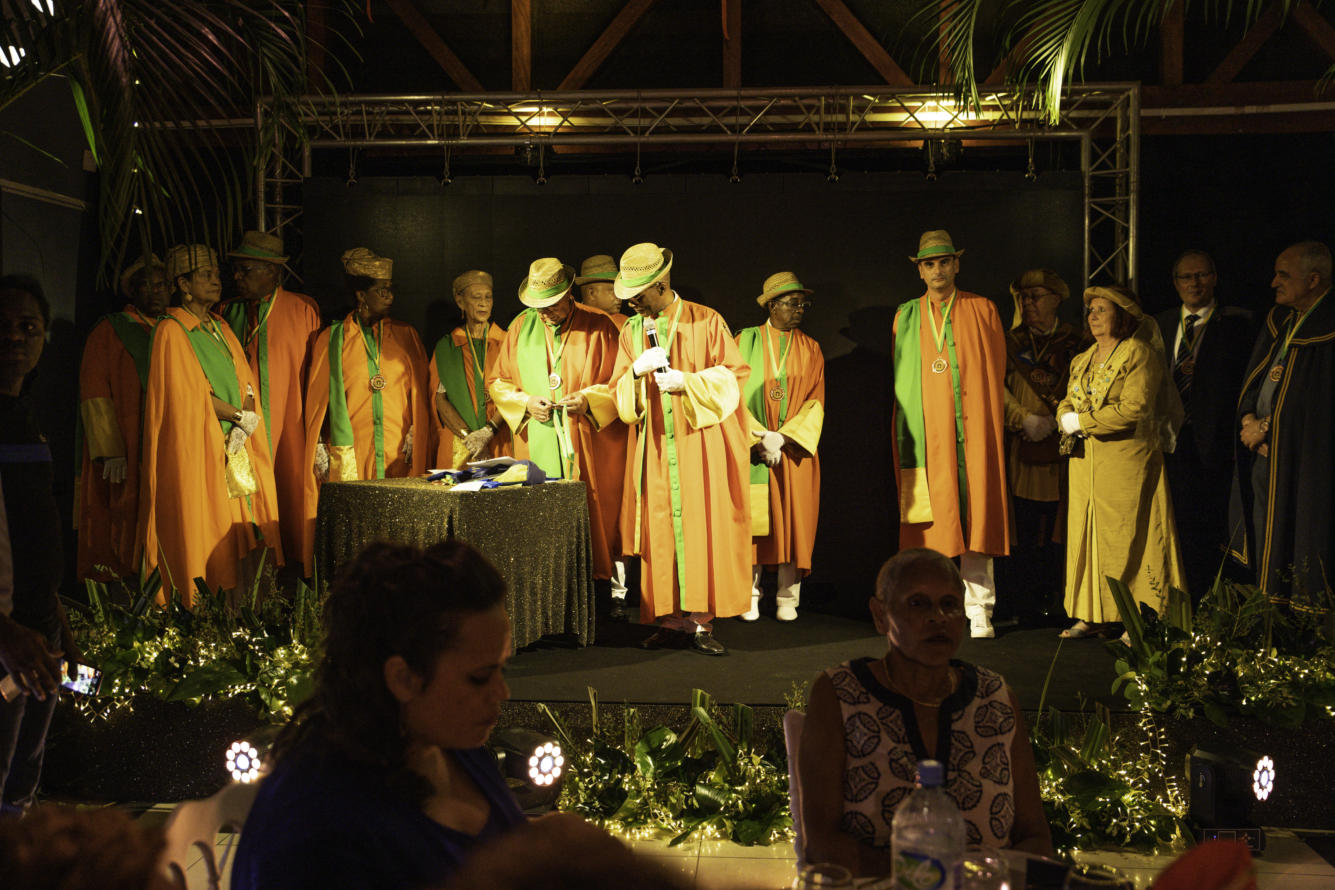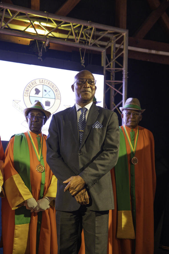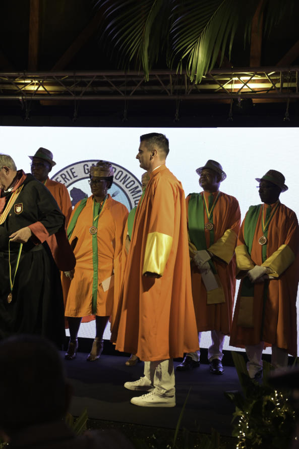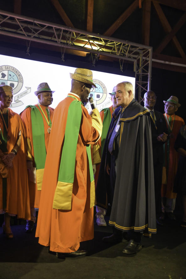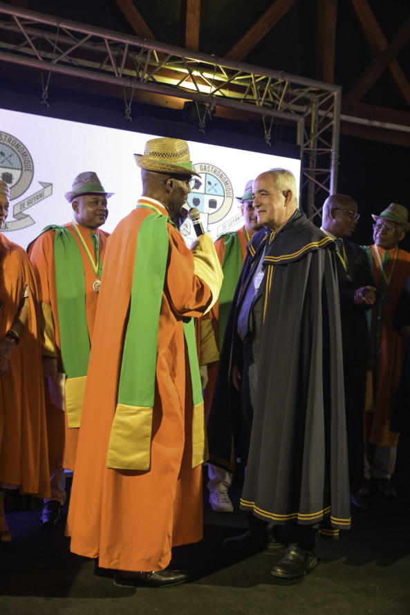 Ils étaient 11, ce samedi 16 avril 2022, à être intronisés membre de la Confrérie du bouillon d’awara. Parmi eux, Serge Fulgence, maître restaurateur, entrepreneur guyanais, et parrain de cette édition, qui œuvre pour l’inscription à l’Unesco du plat traditionnel guyanais.