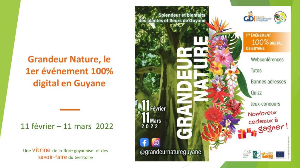 Les Assises du Végétal “Grandeur Nature” seront organisées en Guyane, du 11 février 2022 au 11 mars 2022, par Guyane Développement Innovation (GDI) et la CCDS (Communauté de Communes des Savanes), en partenariat avec la Collectivité Territoriale de Guyane (CTG) avec pour objectif de faire découvrir les splendeurs et bienfaits des plantes et fleurs de Guyane.