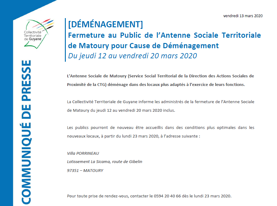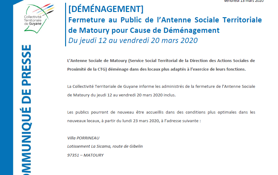 La Collectivité Territoriale de Guyane informe les administrés de la fermeture de l’Antenne Sociale de Matoury du jeudi 12 au vendredi 20 mars 2020 inclus.