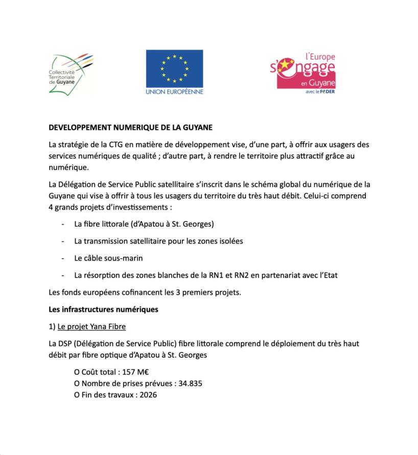 La Délégation de Service Public satellitaire s’inscrit dans le schéma global du numérique de la Guyane qui vise à offrir à tous les usagers du territoire du très haut débit. Celui-ci comprend 4 grands projets d’investissements :