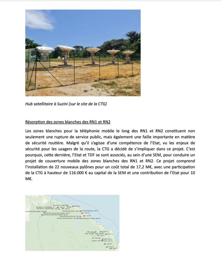 Les zones blanches pour la téléphonie mobile le long des RN1 et RN2 constituent non seulement une rupture de service public, mais également une faille importante en matière de sécurité routière. Malgré qu’il s’agisse d’une compétence de l’Etat, vu les enjeux de sécurité pour les usagers de la route, la CTG a décidé de s’impliquer dans ce projet. C’est pourquoi, cette dernière, l’Etat et TDF se sont associés, au sein d’une SEM, pour conduire un projet de couverture mobile des zones blanches des RN1 et RN2. Ce projet comprend l’installation de 22 nouveaux pylônes pour un coût total de 17,2 M€, avec une participation de la CTG à hauteur de 116.000 € au capital de la SEM et une contribution de l’Etat pour 10 M€.