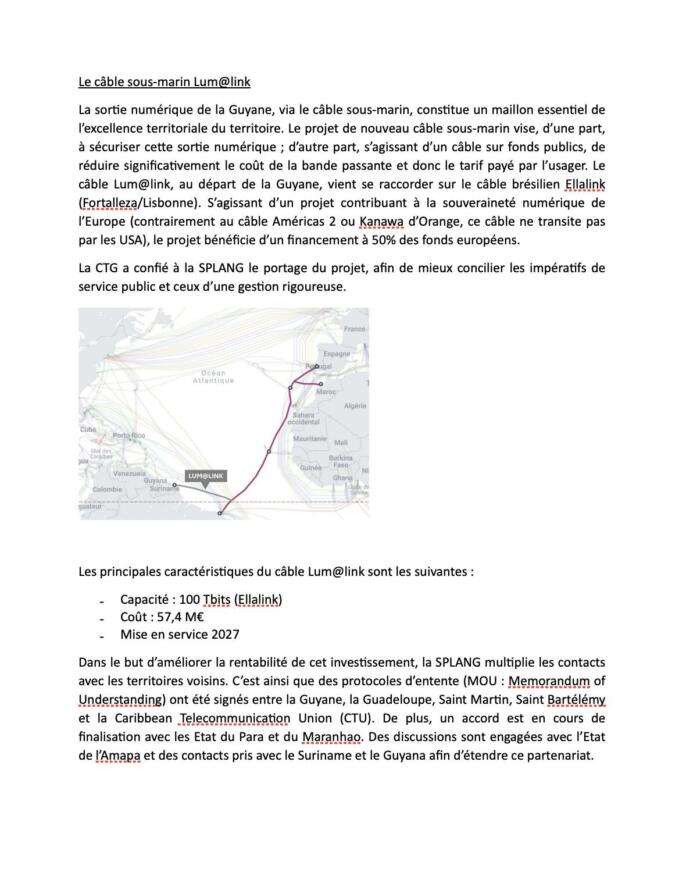La sortie numérique de la Guyane, via le câble sous-marin, constitue un maillon essentiel de l’excellence territoriale du territoire. Le projet de nouveau câble sous-marin vise, d’une part, à sécuriser cette sortie numérique ; d’autre part, s’agissant d’un câble sur fonds publics, de réduire significativement le coût de la bande passante et donc le tarif payé par l’usager. Le câble Lum@link, au départ de la Guyane, vient se raccorder sur le câble brésilien Ellalink (Fortalleza/Lisbonne). S’agissant d’un projet contribuant à la souveraineté numérique de l’Europe (contrairement au câble Américas 2 ou Kanawa d’Orange, ce câble ne transite pas par les USA), le projet bénéficie d’un financement à 50% des fonds européens.