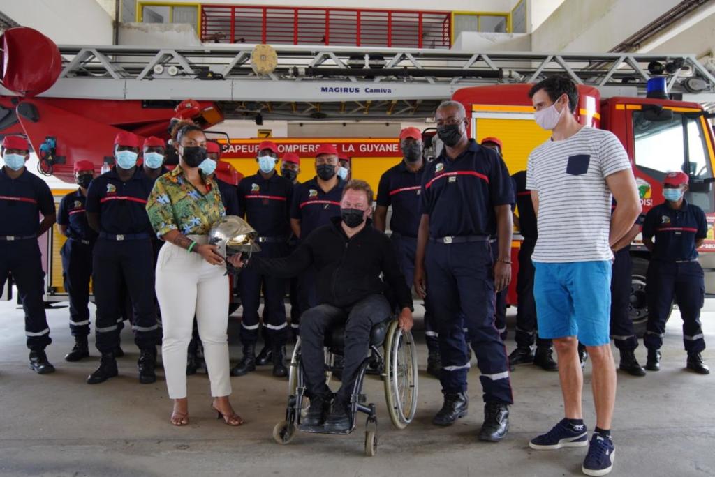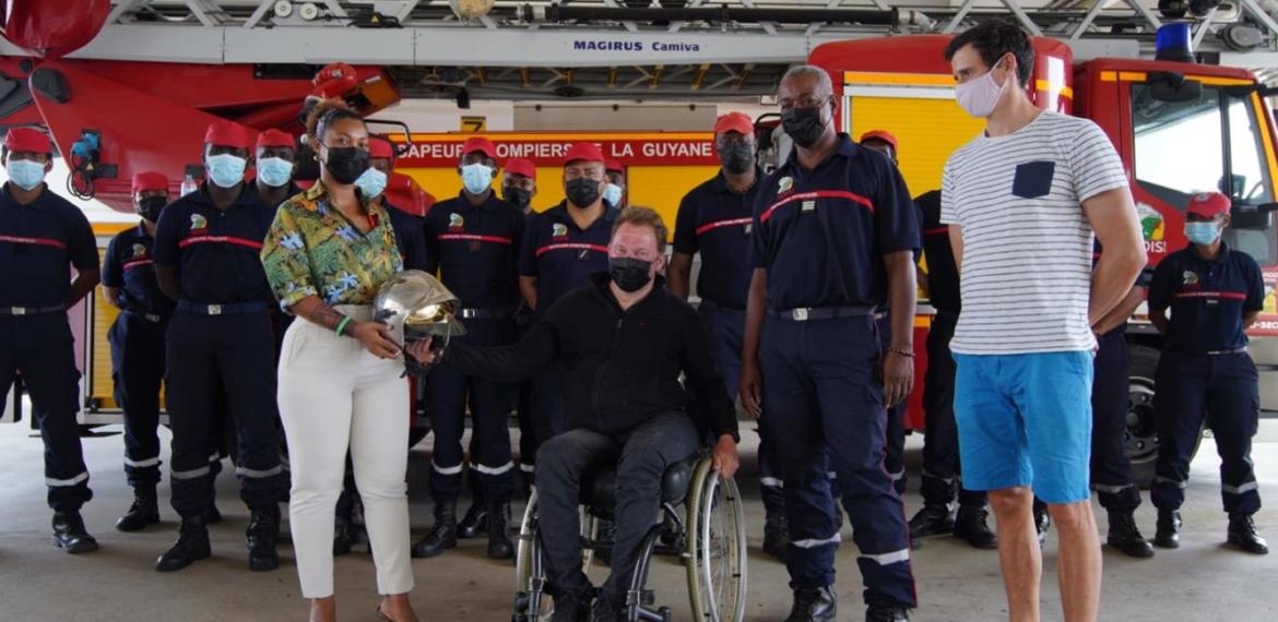 À l’occasion de son séjour sur le territoire Guyanais, dans le cadre du défi sportif, « Handi’Cap sur l’Amazonie », Yann Jondot, ambassadeur national de l’accessibilité a remis un casque d’argent à Thiarra Steenwinkel, 14è vice-présidente déléguée à la sécurité et à la sûreté, ce dimanche 6 février 2022, au centre de secours principal de Cayenne,