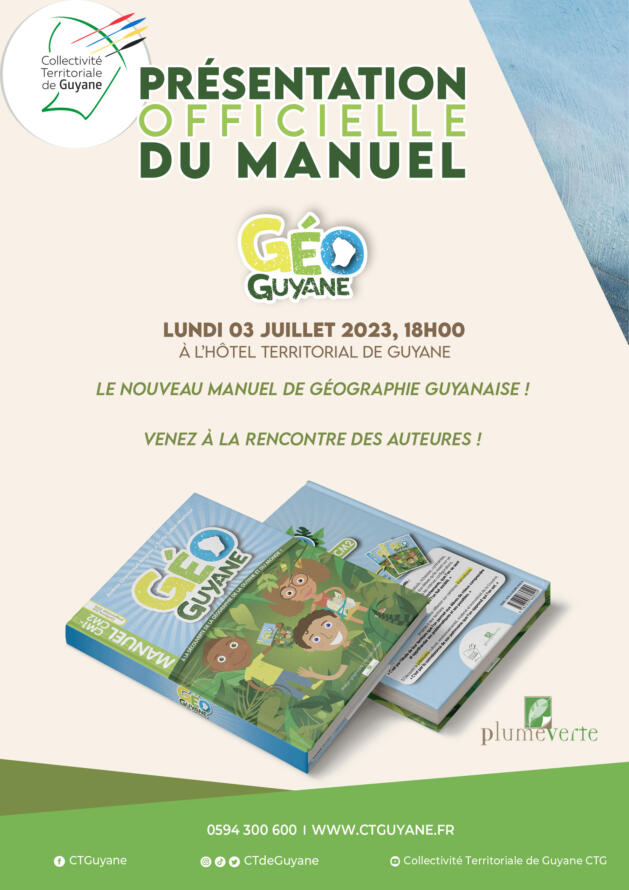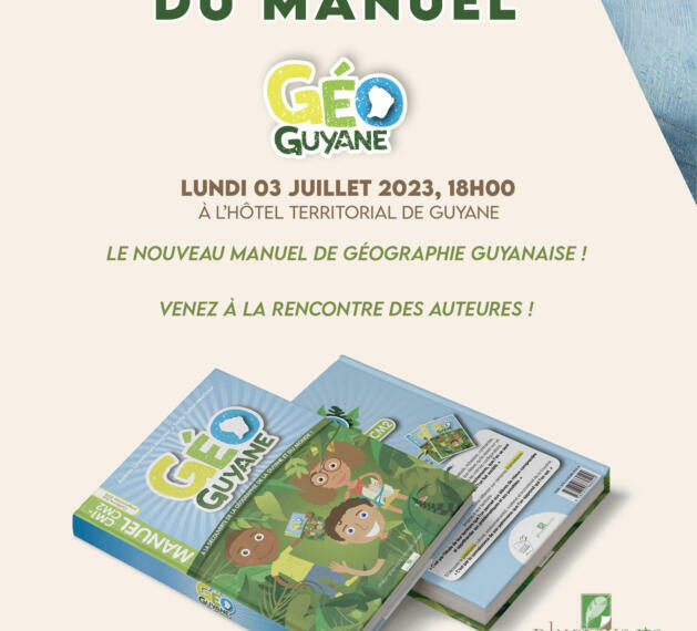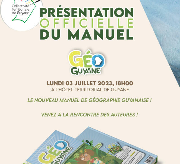 Une présentation officielle du nouveau manuel de géographie guyanaise, “Géo Guyane” dédié aux élèves des classes de CM1/CM2 de Guyane, se déroulera le lundi 3 juillet 2023, à l’Hôtel Territorial, en présence des auteures Audrey Chambaud-Regnier et Émily Sollet-Markour et de l’éditeur “Plume Verte”. La Collectivité Territoriale de Guyane a accompagné l’élaboration et la publication de cet ouvrage.
