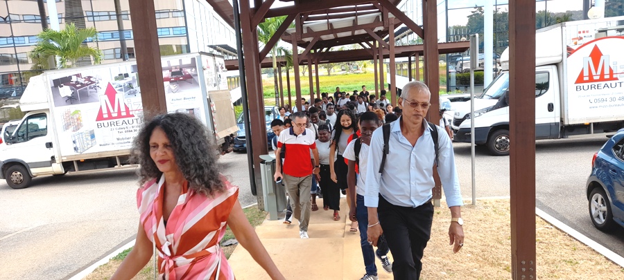 Une délégation d’élèves en classe de Seconde, Première et Terminale du Lycée Professionnel Max Joséphine, issus des communes éloignées de Guyane, accompagnée d’Alain Nguyen Van Danh, proviseur de l’établissement et d’une équipe pédagogique, a été reçue à l’Hôtel Territorial par Annie Robinson-Chocho, 2ème vice-présidente de la Collectivité Territoriale de Guyane (CTG) déléguée à l’Éducation et aux Constructions scolaires. Au programme du déplacement de ce mardi 11 octobre 2022, figuraient la visite pédagogique de l’institution ainsi qu’une conférence-débat en salle d’Assemblée Plénière de l’Hôtel Territorial à Cayenne.