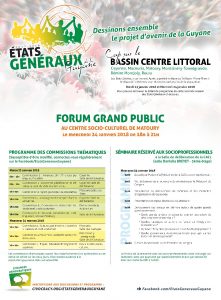 Pour le Bassin Littoral-Centre, il aura lieu au Centre socio-culturel à Matoury, mercredi 24 Janvier 2018 de 18h à 21h. Pour rappel, les échanges tenus en forum sont également enregistrés et compteront pour l’élaboration du livret blanc qui sera remis au Gouvernement à l’issue des Etats Généraux.