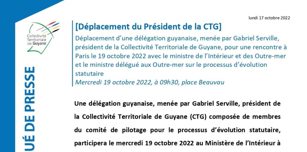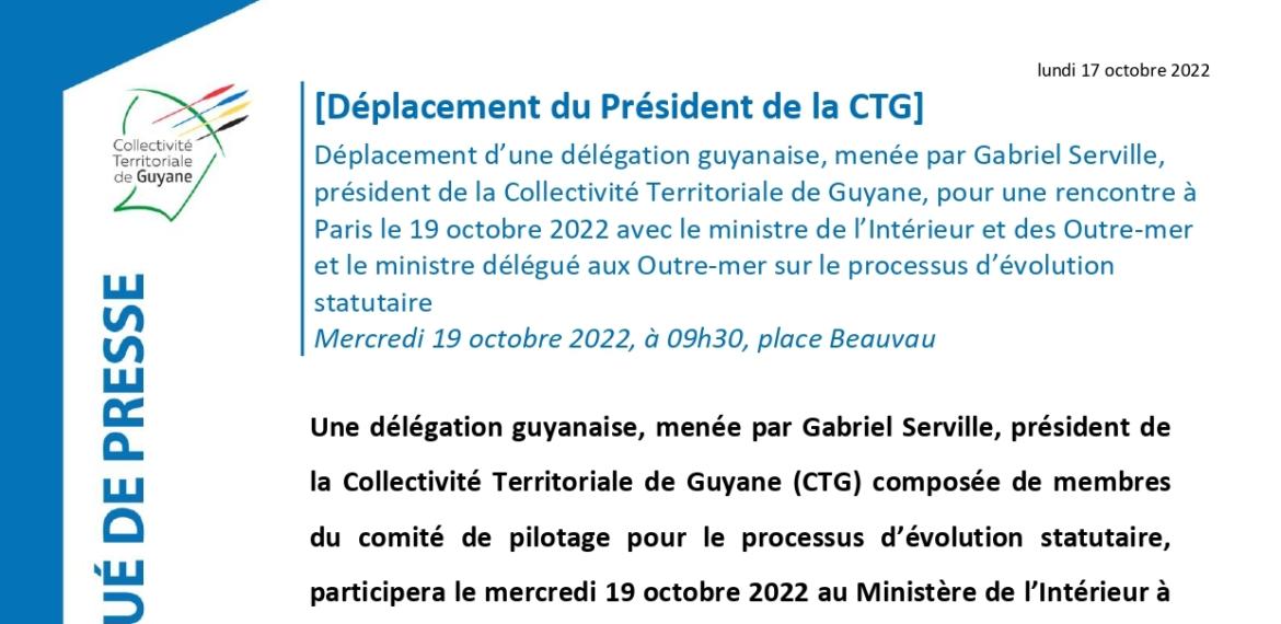 Une délégation guyanaise, menée par Gabriel Serville, président de la Collectivité Territoriale de Guyane (CTG) composée de membres du comité de pilotage pour le processus d’évolution statutaire, participera le mercredi 19 octobre 2022 au Ministère de l’Intérieur à une rencontre avec le ministre de l’Intérieur et des Outre-mer, Gérald Darmanin, et le ministre délégué aux Outre-mer, Jean-François Carenco.