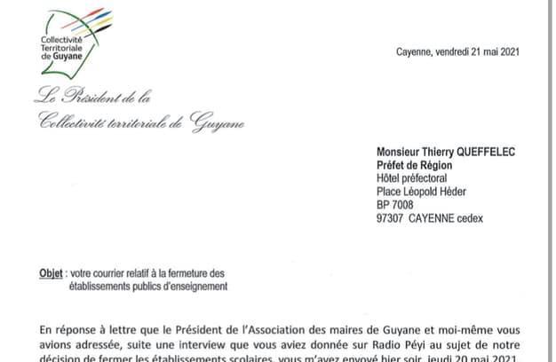 En réponse à la lettre que le Président de l’Association des maires de Guyane et moi-même vous avions adressée, suite une interview que vous aviez donnée sur Radio Péyi au sujet de notre décision de fermer les établissements scolaires, vous m’avez envoyé hier soir, jeudi 20 mai 2021, un courrier visant à réitérer le caractère prétendument illégal de cette décision.