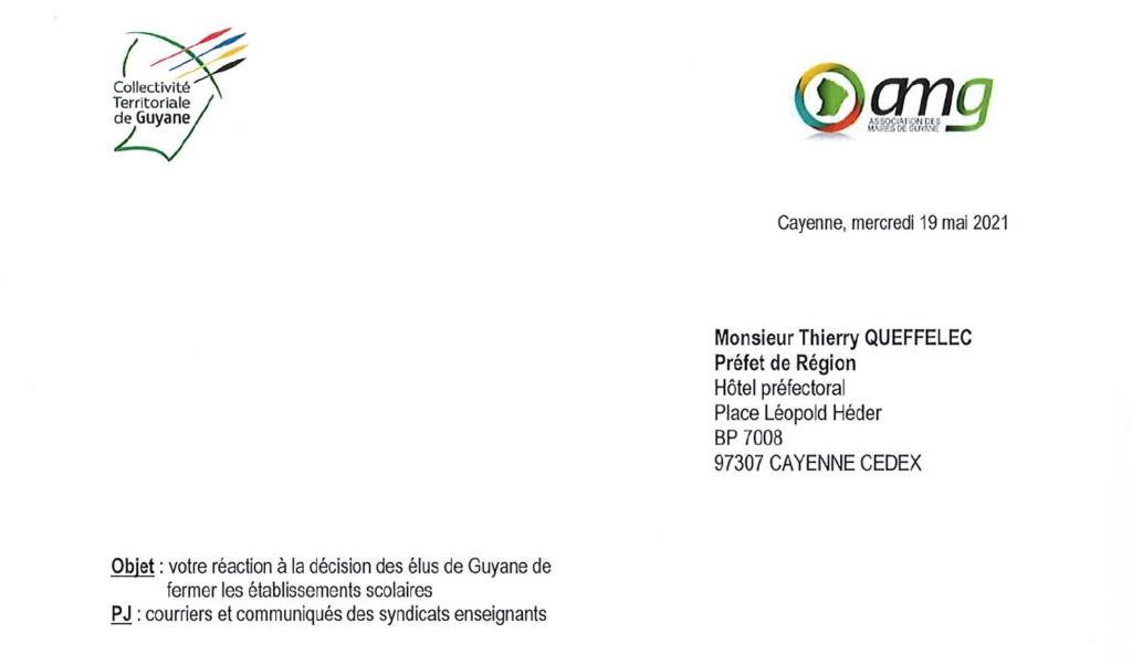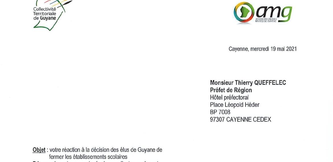 [Fermeture des établissements scolaires] Courrier Commun de la Collectivité Territoriale de Guyane et de l’Association des Maires de Guyane à l’attention du Préfet de Guyane