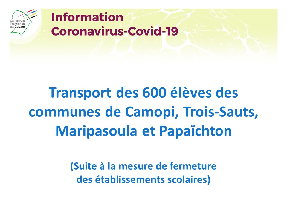 Dans le cadre des mesures de prévention liées à l’épidémie de coronavirus covid-19, la Collectivité Territoriale de Guyane organise le transport des élèves des communes de Camopi, Trois-Sauts, Maripasoula et Papaïchton.