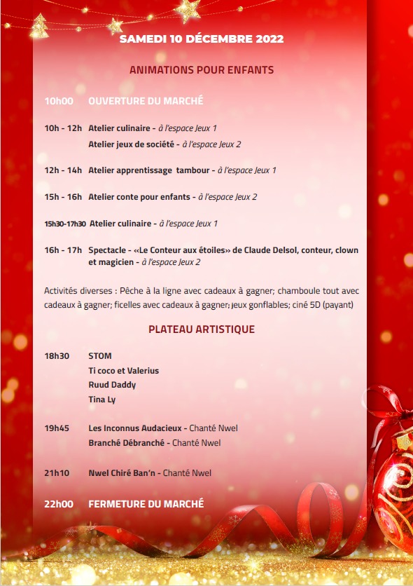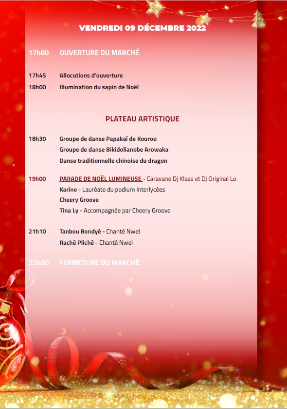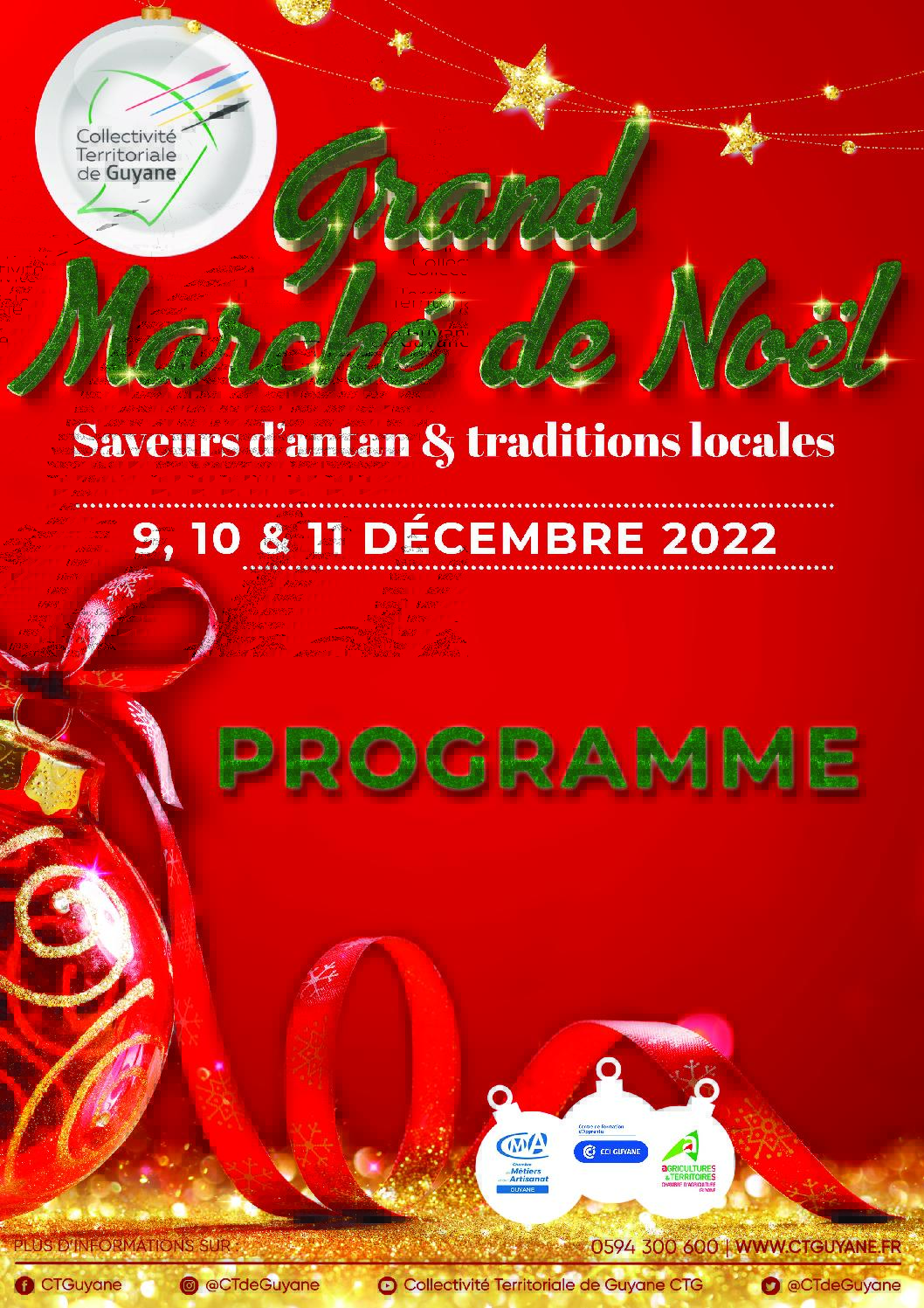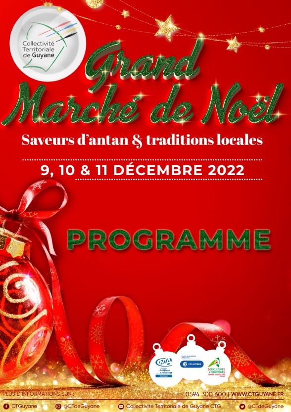 La Collectivité Territoriale de Guyane, organise la première édition de son Grand Marché de Noël, les vendredi 9, samedi 10 et dimanche 11 décembre 2022, sur le parking de l’Hôtel Territorial, en partenariat avec la CMA, la Chambre d’Agriculture et la CCI. Découvrez le programme détaillé de cet évènement qui se veut féérique, mémorable et populaire, sous la thématique de Noël « Saveurs d’antan, traditions locales ».