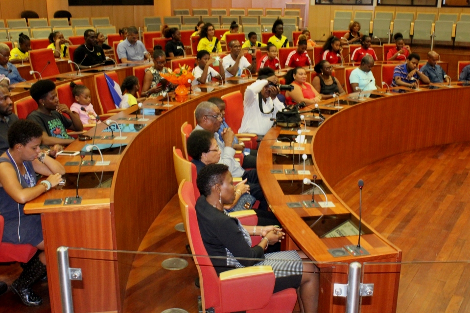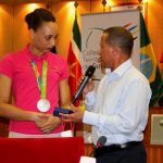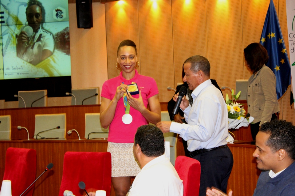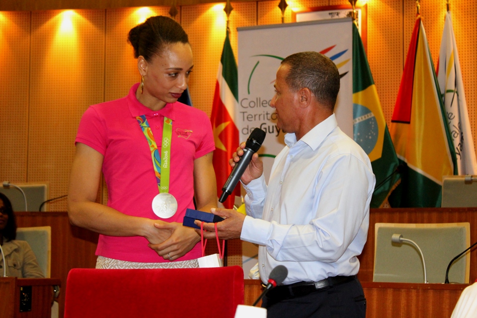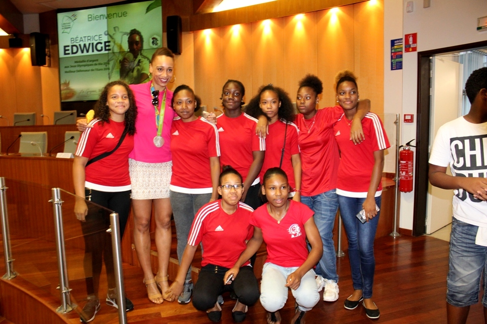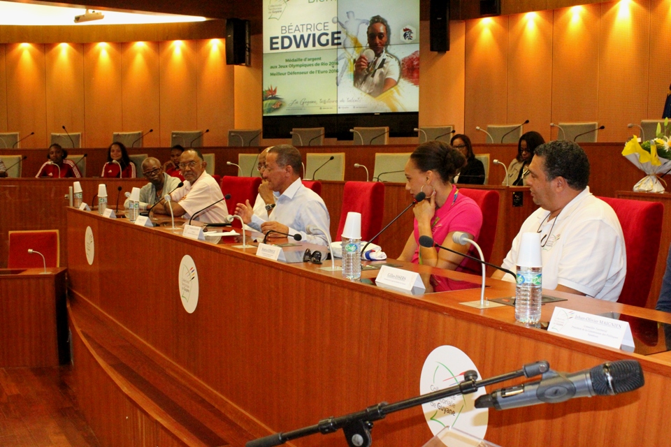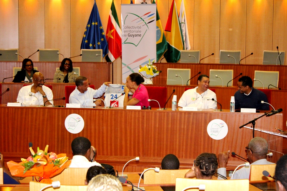 Venu le moment des échanges, le président du CROSGUY a salué la performance et le parcours de la handballeuse. Le maire de Mana est intervenu à son tour : “c’est toute la fierté du père et de l’élu… Béatrice, c’est un exemple et modèle pour tous les clubs de Guyane.” Après ces quelques mots, le président de la Collectivité Territoriale de Guyane a pris la parole : «nous recevons une Guyanaise qui est notre ambassadrice et qui fait parler de notre territoire amazonien. Comme nous l’avons souvent dit, en observant les ratios par habitant, la Guyane fournie autant de champions que n’importe quel département du territoire de la France… Sans s’étendre sur les efforts consentis pour équiper le territoire de moyens structurants et de cadres de haut niveau, il a conclu ses propos en exprimant toute son admiration et ses félicitations pour l’exploit sportif réalisé au sein des Bleus, avant d’honorer la sportive de haut-niveau de la Médaille honorifique de la CTG. En retour, le Président de la CTG s’est vu offrir par Béatrice EDWIGE le maillot de l’équipe de France.