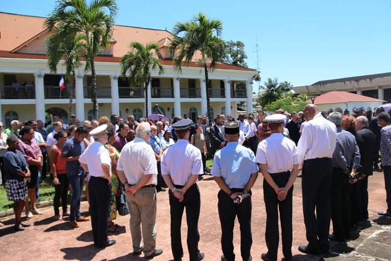 Pendant une minute, le président de la collectivité territoriale, Rodolphe Alexandre, le préfet de Guyane, Martin Jaeger, les parlementaires, et plusieurs élus locaux se sont figés dans le silence pour un instant de recueillement sur la place Léopold Héder à Cayenne.