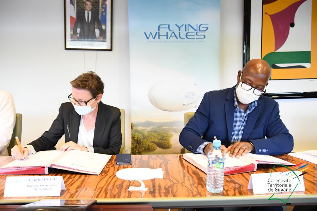 Gabriel Serville, président de la Collectivité Territoriale de Guyane (CTG), et Michèle Renaud, Directrice Marketing, Vente et Communication de Flying Whales, ont signé vendredi 15 octobre 2021 un accord de partenariat afin d’étudier le déploiement de la solution LCA60T sur le territoire Guyanais. Était également présent lors de cette signature Philippe Bouba, 5ème Vice-Président délégué à l’Enseignement Supérieur et à la Recherche.