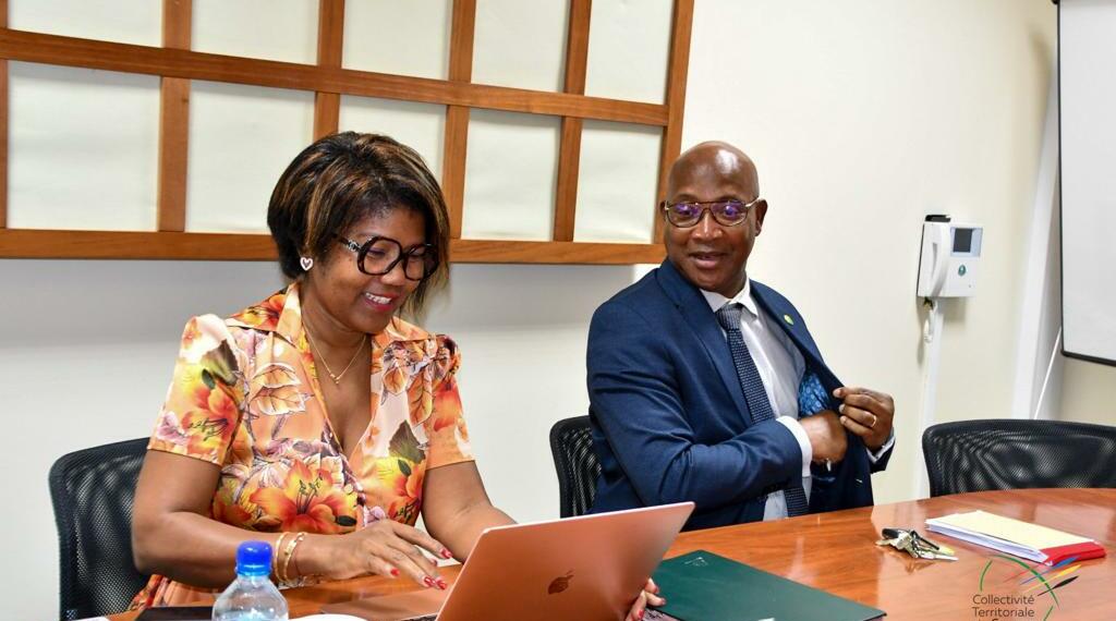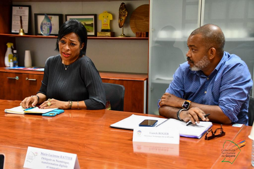 Mardi 18 avril 2023, Gabriel Serville, président de la Collectivité Territoriale de Guyane recevait Magaly Nicolas- Nelson, directrice des ventes et du développement commercial chez @Eutelsat, en présence de Marie-Lucienne Rattier, conseillère territoriale déléguée au Numérique, à la transformation digitale et à l’innovation, et de Franck Rogier, directeur technique de la SPLANG.