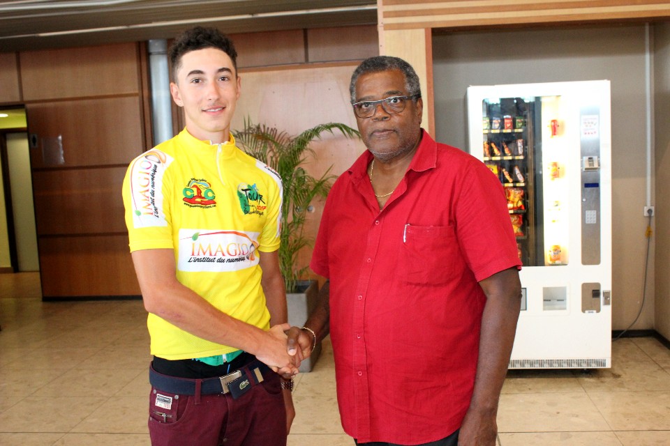 Jean Claude Labrador accueille les cyclistes Dylhan Will et Teddy Ringuet après leurs brillantes performances au Tour Cycliste 2017 de la Guadeloupe junior et au Tour Cycliste International 2017 de Martinique Sénior