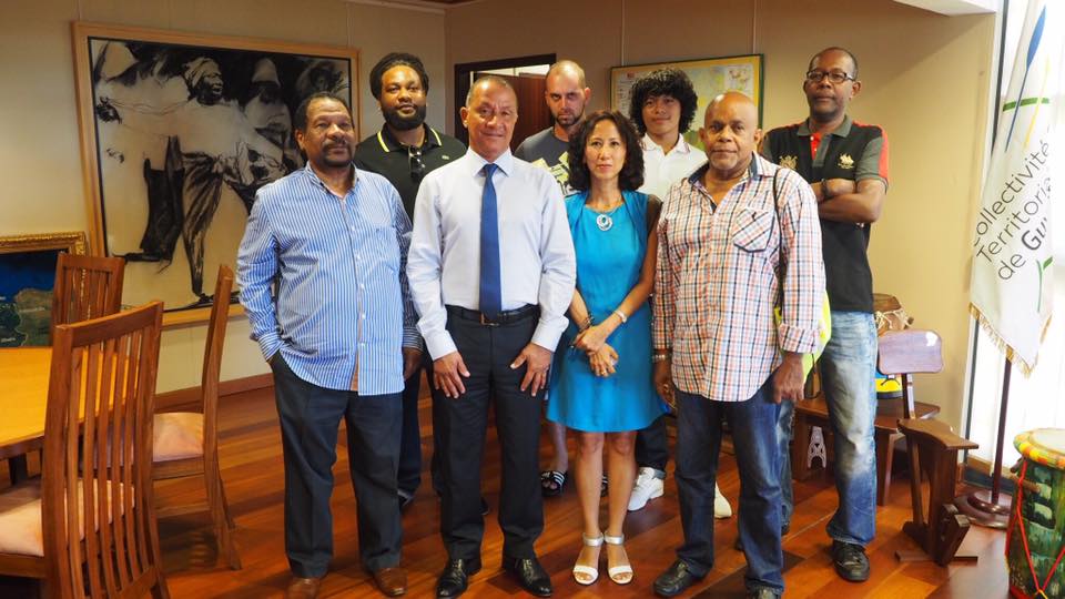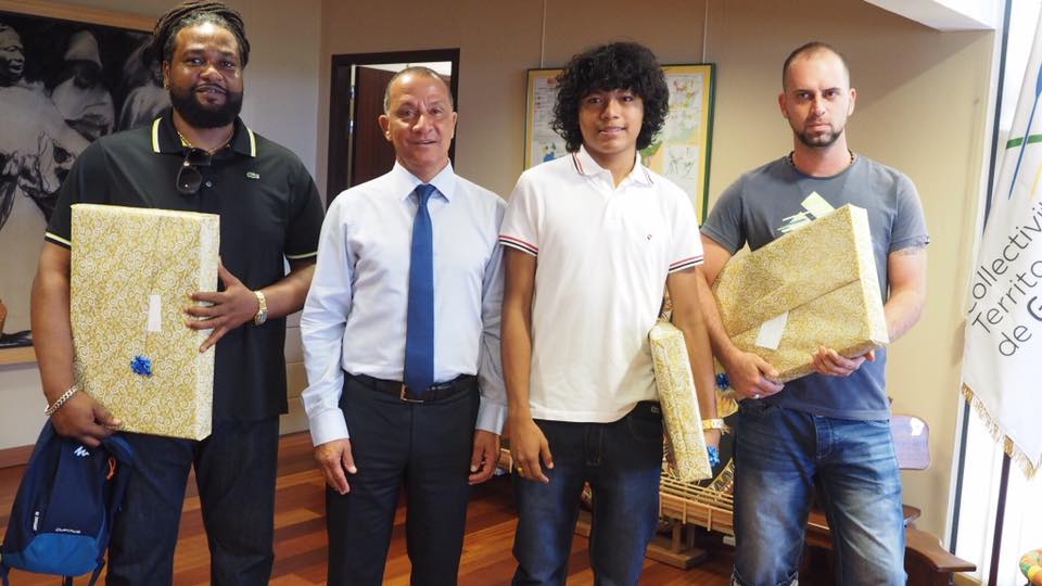 En présence du Délégué régional de l’Agence de l’Outre-Mer pour la Mobilité (LADOM), Victor Laupa et de leurs mentors de la société Air Guyane, le responsable technique, José Octaville, et le technicien d’expérience, Luc Zulemaro, Rodolphe Alexandre a eu le plaisir de leur remettre du matériel informatique qui les équipera durant l’exigeante année de formation qu’ils suivront dans ce prestigieux institut.