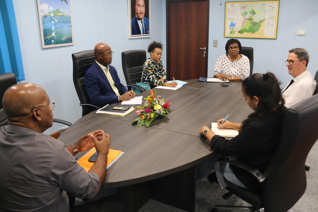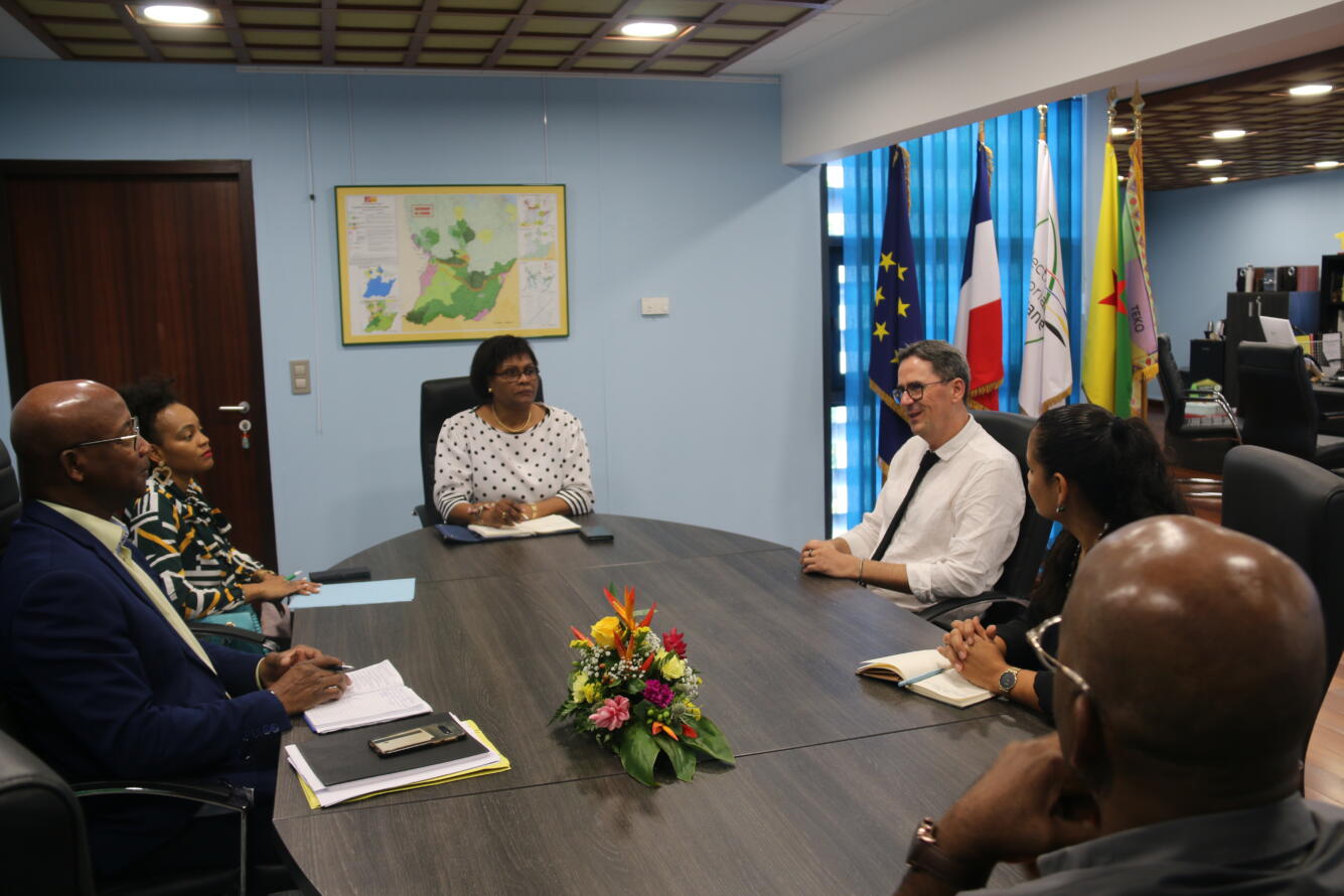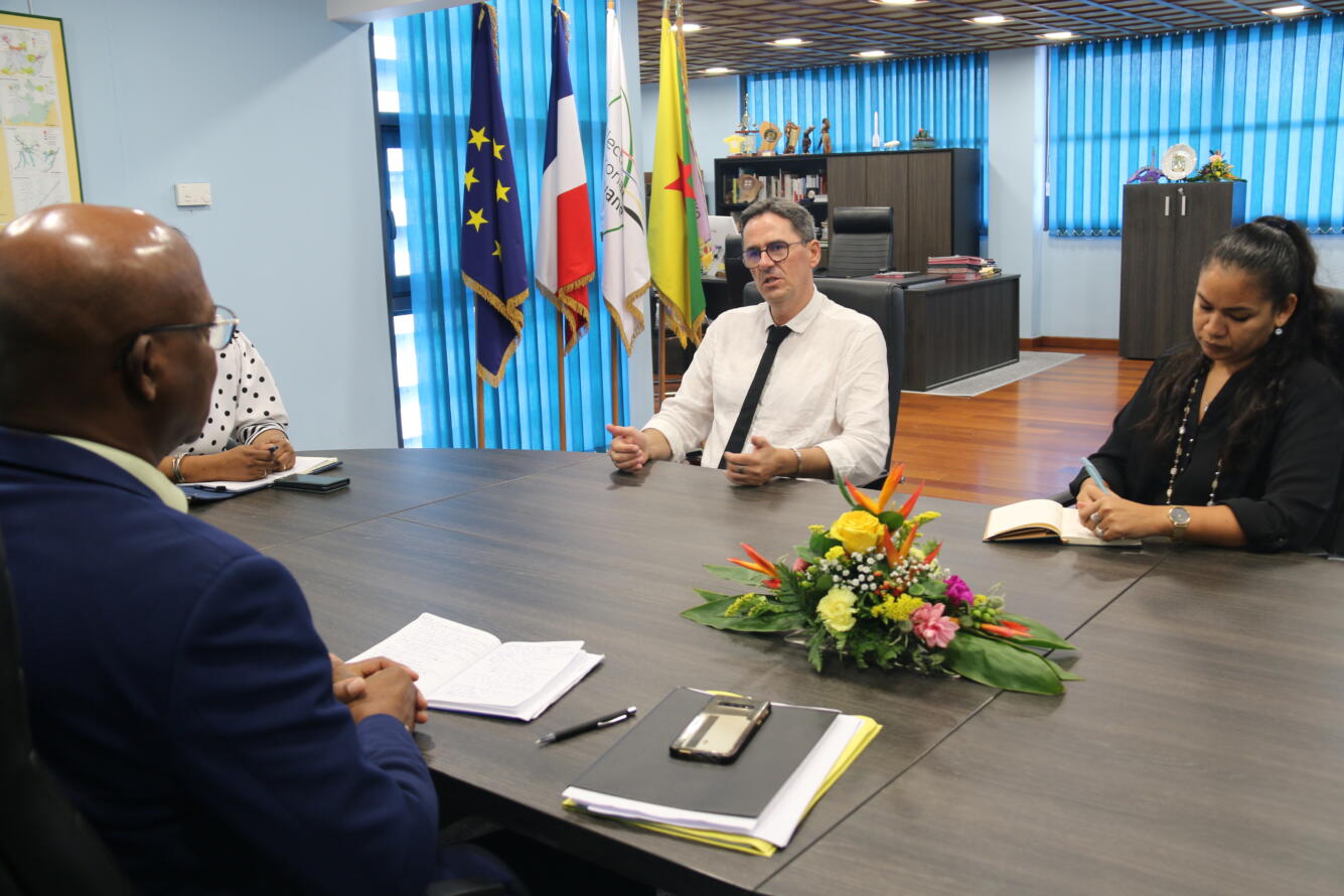 Gabriel Serville, président de la Collectivité territoriale de Guyane, rencontrait ce mardi 16 janvier 2024, Jean-François Foissac, nouveau directeur territorial de la Protection judiciaire de la jeunesse en présence de Bernadette Duclona-Constant, 10è vice-présidente déléguée à la citoyenneté et au vivre-ensemble et de ses collaborateurs.