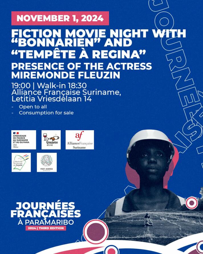 - le 1er novembre 2024 : projection de deux court-métrages Bonnarien, en présence de l’actrice Saint Laurentaise Miremonde FLEUZIN, et Tempête à Régina. Ces deux films de fiction ont été produit par Justine MATHIEU, cheffe d’entreprise de Post-Genres, et soutenu par la CTG. Lieu de la projection: Alliance Française du Suriname à 18h30.
