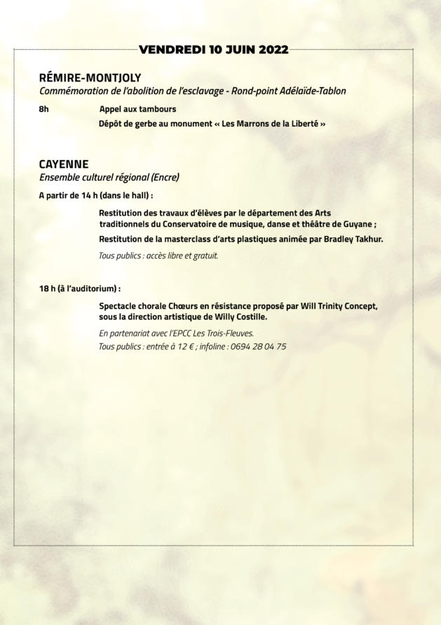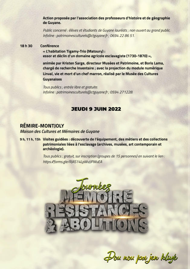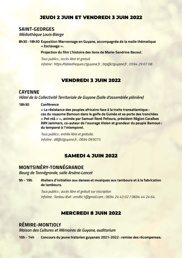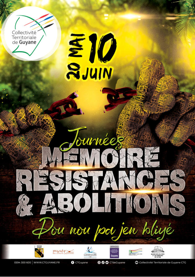 Dans le cadre de la commémoration de l’Abolition de l’esclavage en Guyane, la Collectivité Territoriale de Guyane organise les « Journées Mémoires, Marronnage et Abolitions 2022 » qui se tiendront jusqu’au 10 juin 2022.