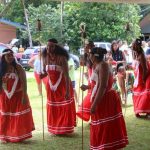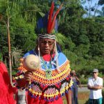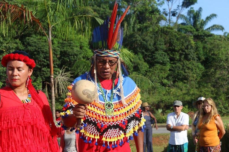 Une fois le cortège arrivé aux pieds du chamane, les chefs coutumiers amérindiens se sont illustrés par des chants rythmés par le son des hochets, instruments qui symbolisent le mouvement vibratoire des forces cosmiques qui se diffusent dans toutes les directions et qui agissent comme la “parole” du divin, devant l’assistance.