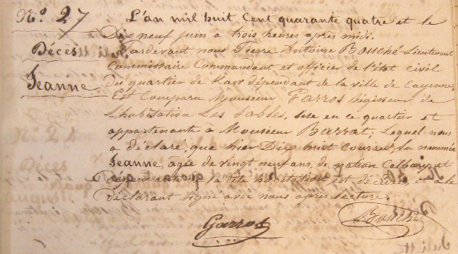 « Article 1er – Les commissaires-commandants dans les quartiers et à Cayenne, le lieutenant commissaire commandant de la ville, remplissant les fonctions d’officier de l’état-civil, sont chargés de recevoir les déclarations de naissances, de mariages et de décès des esclaves. Les déclarations seront faites verbalement ou par écrit. Dans le dernier cas, l’écrit sera déposé à la fin de l’année au greffe du tribunal avec le double du registre dont le dépôt doit avoir lieu audit greffe. »