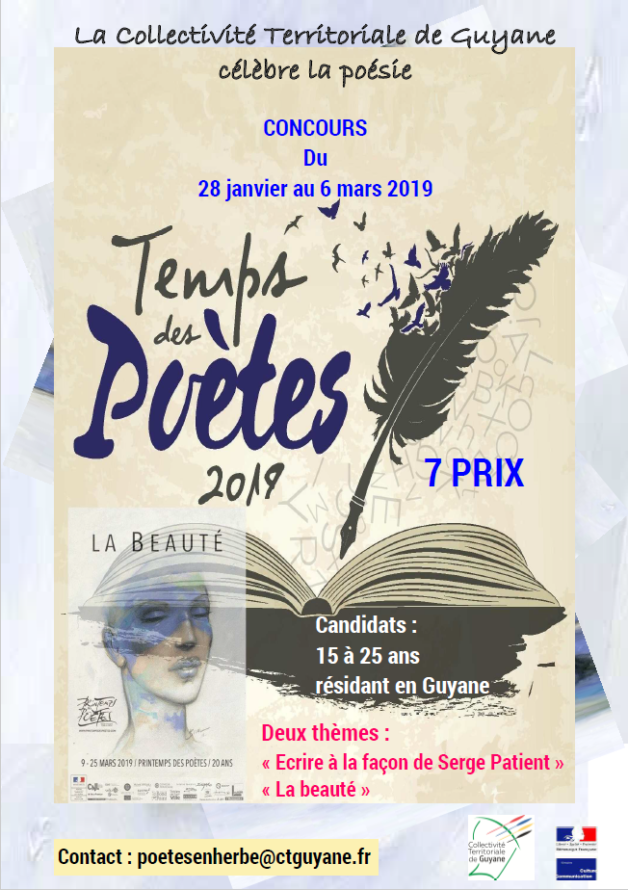 Les écrits ne doivent dépasser 3000 signes maximum. Leur envoi doit se faire avant le mercredi 6 mars 2019 au plus tard, à minuit, exclusivement par mail, en pièce jointe sous format PDF à l’adresse suivante : poetesenherbe@ctguyane.fr