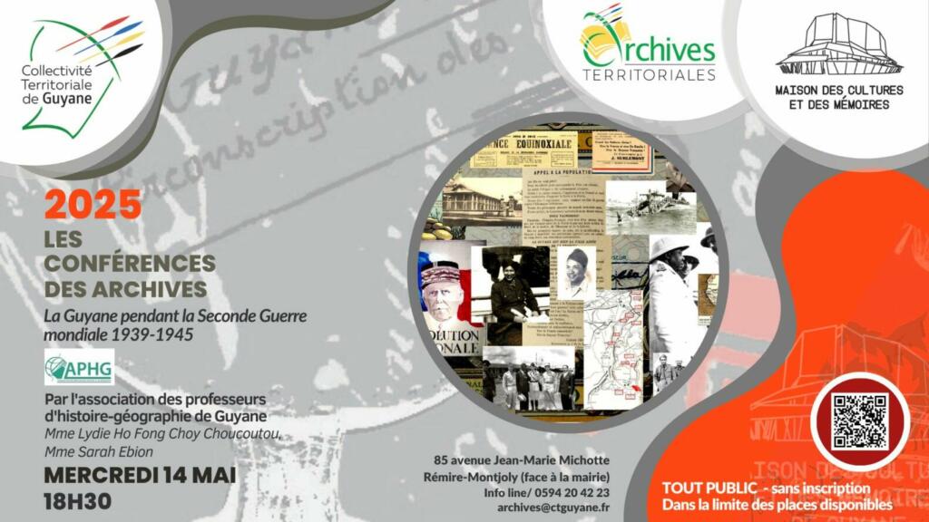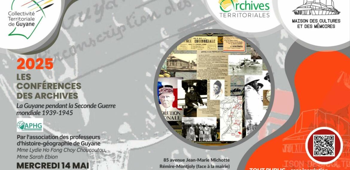 Dans le cadre du cycle Les Conférences des Archives, la Collectivité Territoriale de Guyane propose une nouvelle rencontre autour de l’histoire du territoire : « La Guyane pendant la Seconde Guerre mondiale, 1939-1945 », le mercredi 14 mai 2025 à 18h30, à l’auditorium de la Maison des Cultures et des Mémoires de Guyane (MCMG).