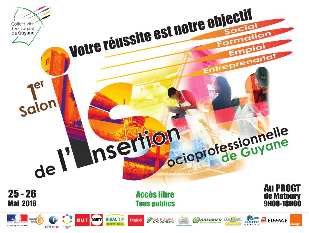 C’est dans ce contexte socioéconomique difficile que la Collectivité Territoriale de Guyane, en charge de la politique contribuant à l’autonomie sociale et professionnelle des personnes les plus éloignées de l’emploi sur son territoire, en partenariat notamment avec l’état, organise le 1er salon de l’insertion socioprofessionnelle les 25 et 26 mai prochains, au PROGT.