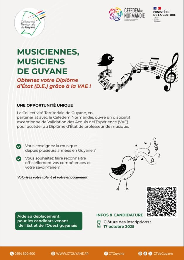 Ce dispositif s’adresse aux musiciennes et musiciens expérimentés qui enseignent déjà depuis plusieurs années en Guyane et souhaitent obtenir le diplôme d’État par une voie plus rapide, en reconnaissance de leur parcours et de leur pratique professionnelle.