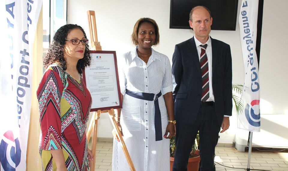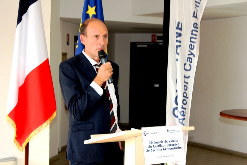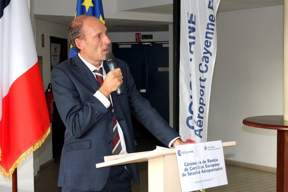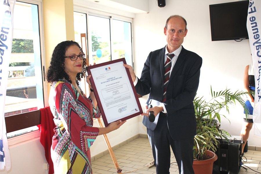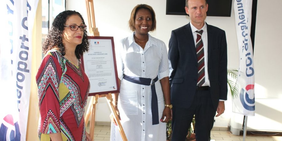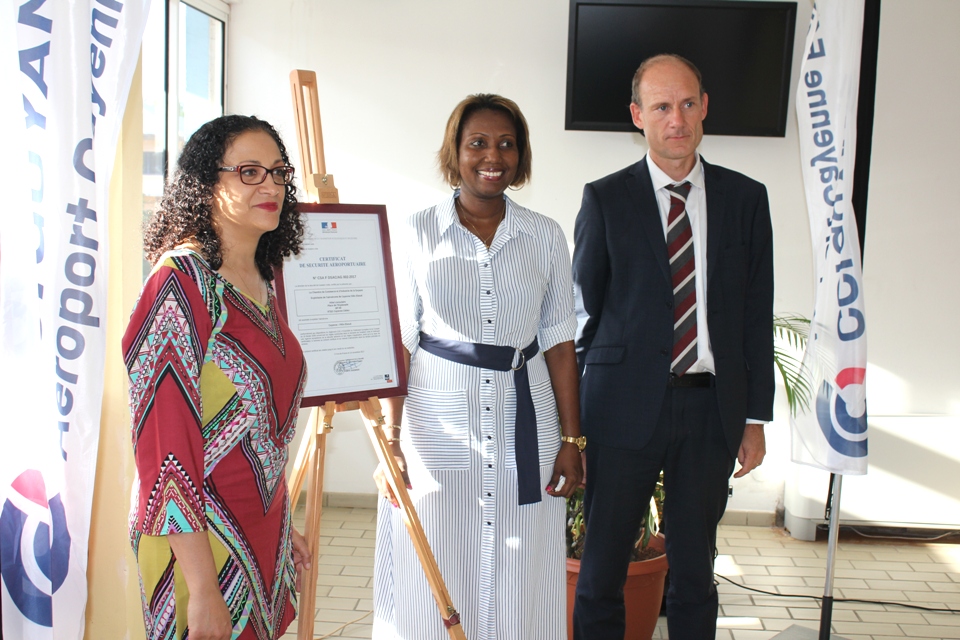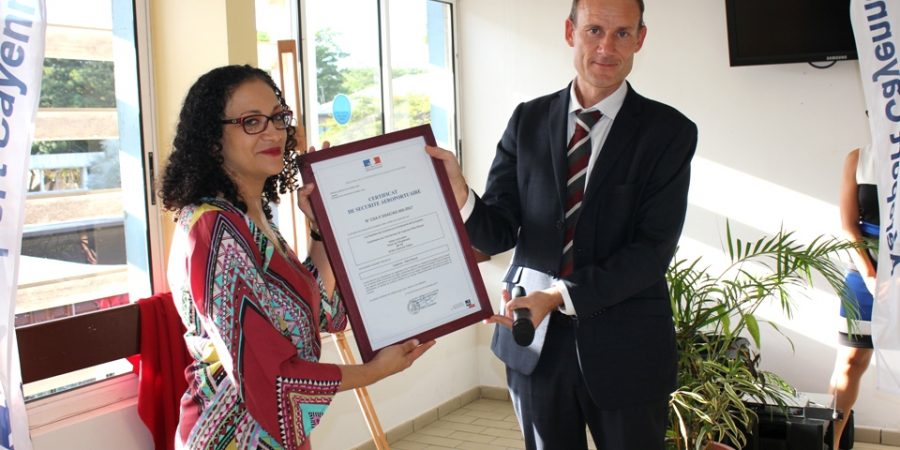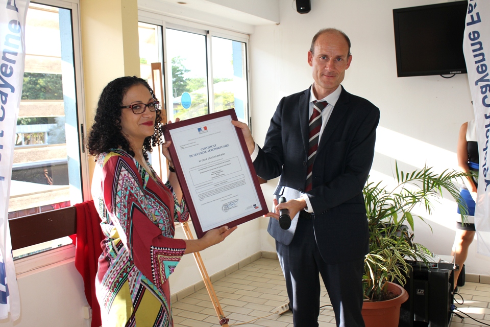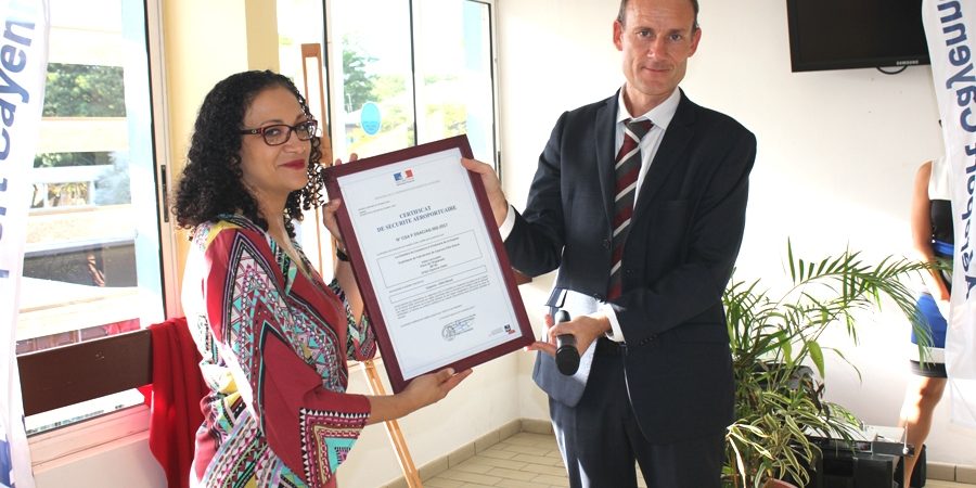La cérémonie de remise du Certificat Européen de Sécurité Aéroportuaire s’est déroulée ce vendredi 24 novembre 2017 à la Chambre de Commerce et d’Industrie de Région Guyane (CCI-Guyane), place de l’Esplanade à Cayenne en présence de nombreux invités parmi lesquels, la présidente de la CCI-Guyane, Carine Sinaï-Bossou, le Directeur Interrégional de la Sécurité de l’Aviation Civile aux Antilles-Guyane et des représentants du monde consulaire et de l’aviation civile.