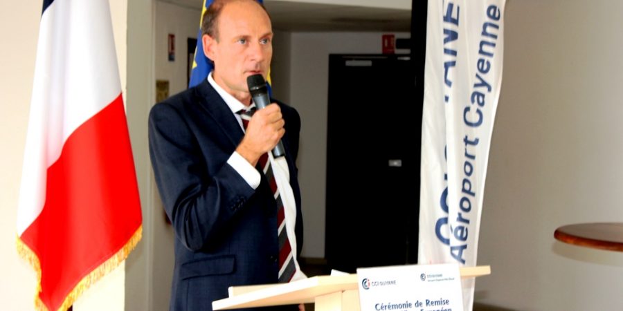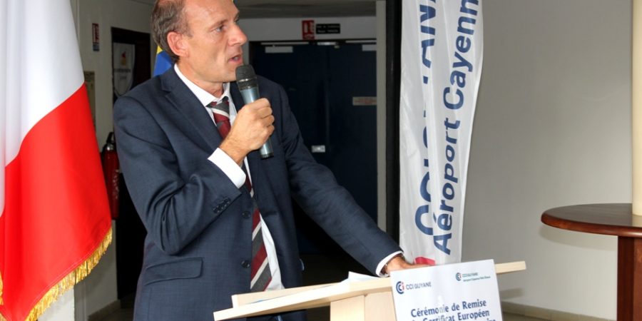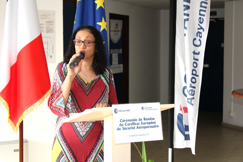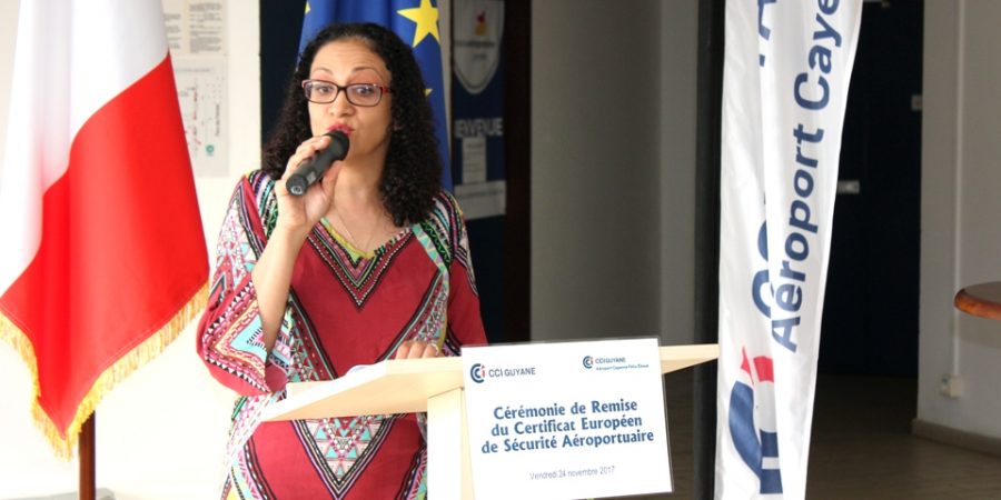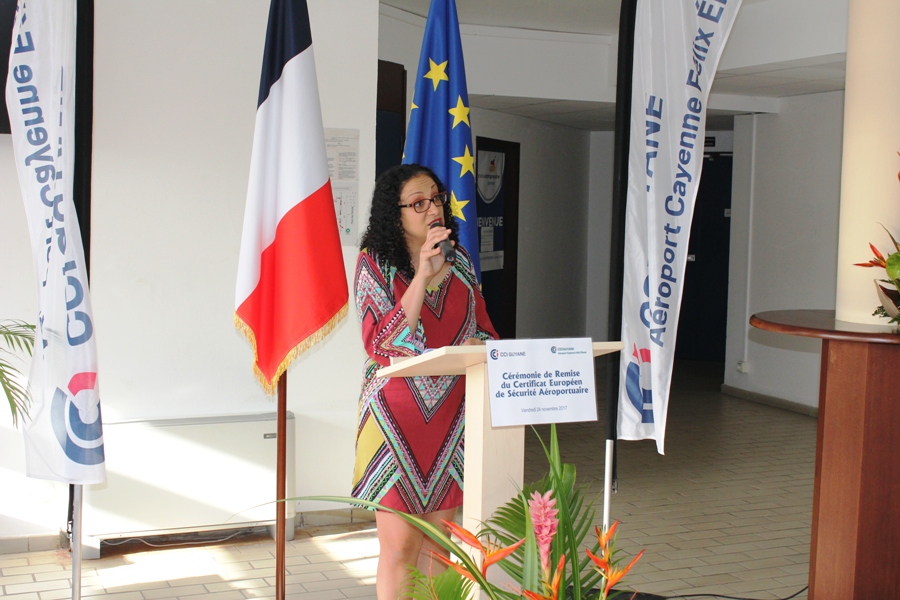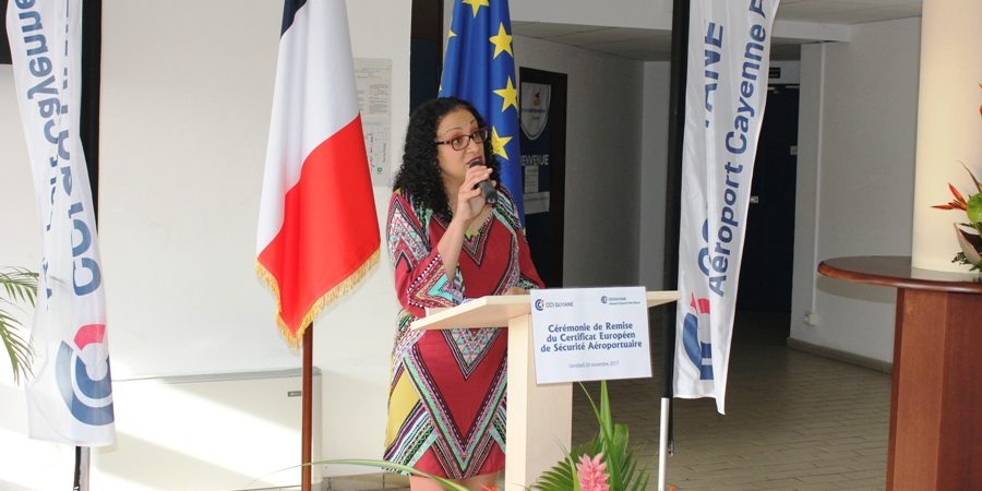 Dans son discours d’ouverture, la présidente de la CCI-Guyane, Carine Sinaï-Bossou a adressé ses remerciements au Directeur Interrégional de la Sécurité de l’Aviation Civile aux Antilles-Guyane, Frédéric Guignier venu des Antilles remettre en mains propres ce Certificat Européen de Sécurité Aéroportuaire. « Cette distinction témoigne de notre capacité de gestionnaire de pouvoir répondre aux exigences européennes les plus strictes pour l’exploitation et la sécurité aéroportuaire », souligne la présidente de la CCI-Guyane. Elle poursuit, « aujourd’hui, nous pouvons dire, que nous entrons dans la « Cour des Grands Aéroports Européens » après un long parcours et une collaboration des plus fructueuses entre la CCI-Guyane, la Direction Générale de l’Aviation Civile (DGAC) et ses autres partenaires en particulier, la Direction de l’Environnement, de l’Aménagement et du Logement de la Guyane (DEAL) et le Service de Navigation Aérienne (SNA) ».