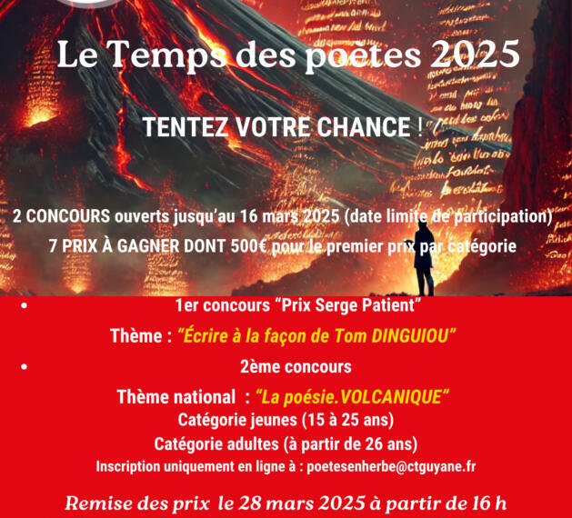Les productions doivent être envoyées avant le 16 mars 2025 à minuit à l’adresse : poetesenherbe@ctguyane.fr