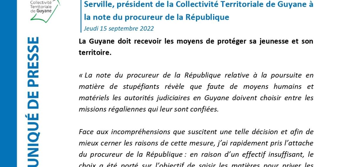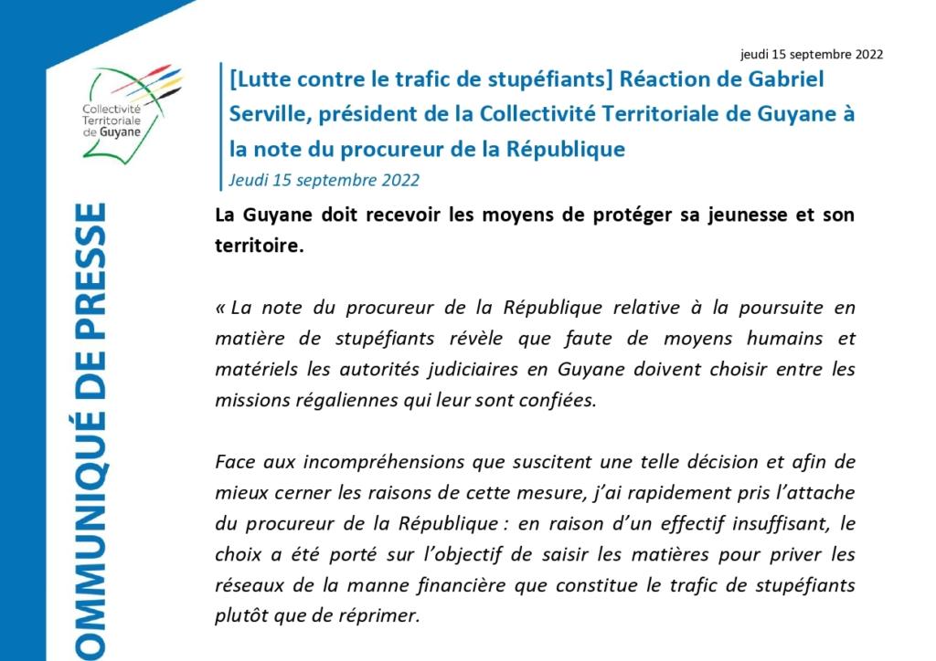 [Lutte contre le trafic de stupéfiants] Réaction de Gabriel Serville, président de la Collectivité Territoriale de Guyane, à la note du procureur de la République