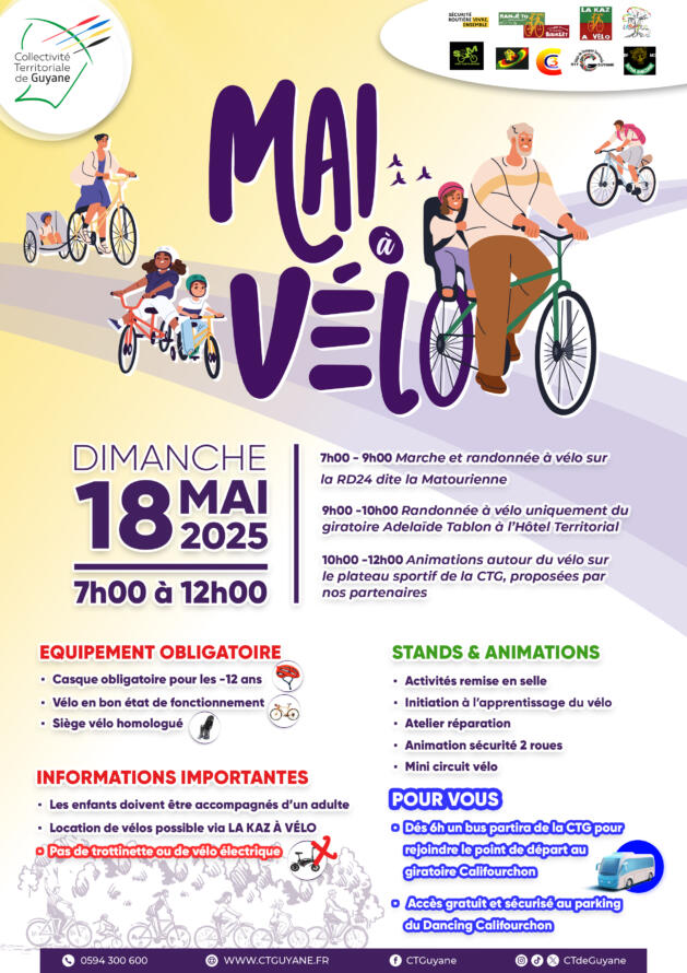 La Collectivité Territoriale de Guyane organise la 1ère édition de “Mai à Vélo”, une randonnée cyclable et pédestre ouverte à tous, le dimanche 18 mai 2025, sur la Voie verte de la Matourienne.