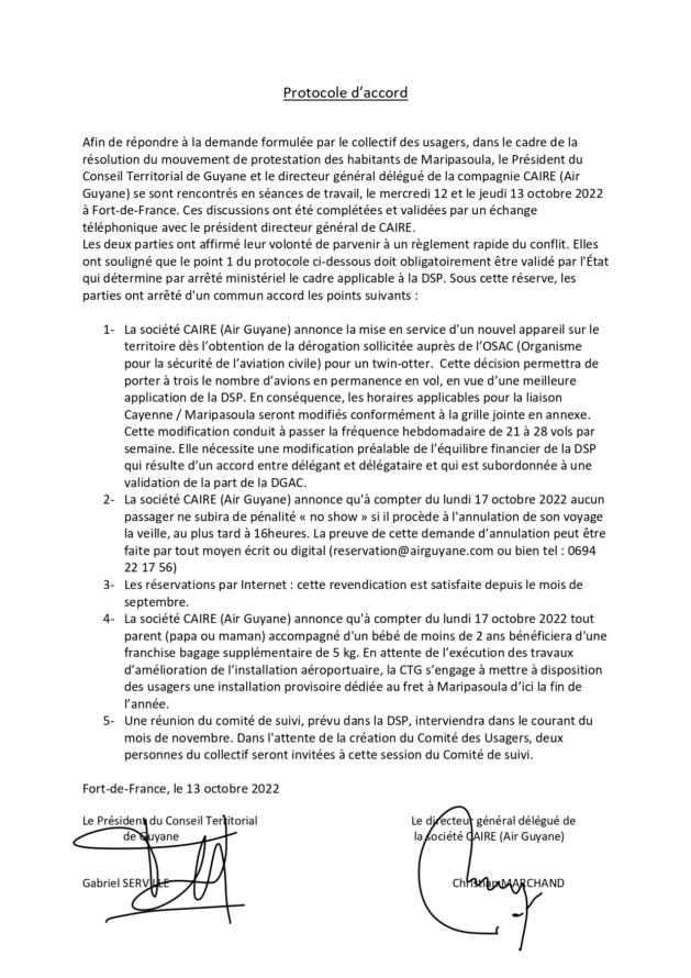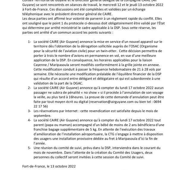 Afin de répondre à la demande formulée par le collectif des usagers, dans le cadre de la résolution du mouvement de protestation des habitants de Maripasoula, Gabriel Serville, président de la Collectivité Territoriale de Guyane, et Christian Marchand, directeur général délégué de la compagnie CAIRE (Air Guyane), se sont rencontrés en séances de travail, le mercredi 12 et le jeudi 13 octobre 2022 à Fort-de-France. Ces discussions ont été complétées et validées par un échange téléphonique avec le président directeur général de CAIRE.