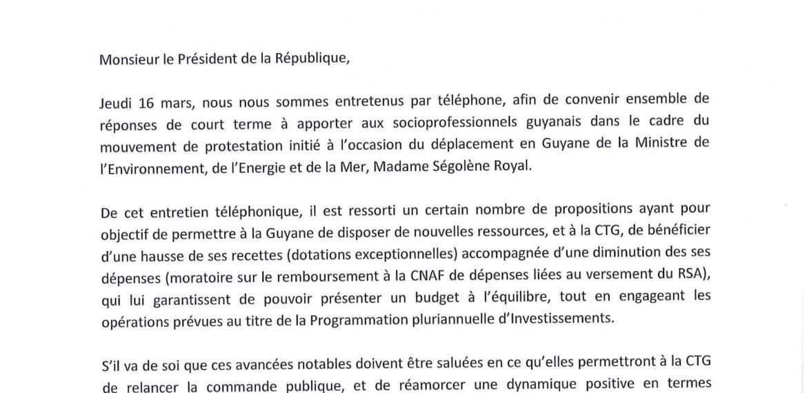 Face au climat social tendu qui règne actuellement dans le département, le Président de la Collectivité Territoriale de Guyane a tenu à interpeller le Président de la République en lui adressant un courrier daté du 21 mars 2017.