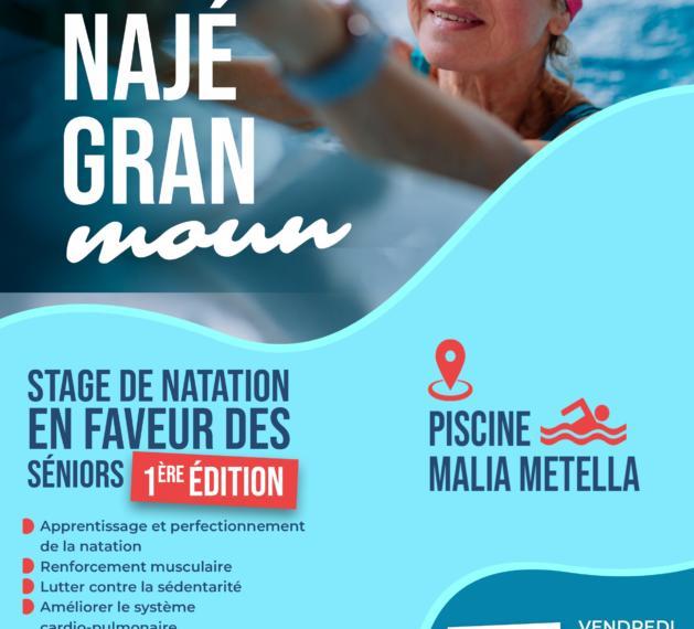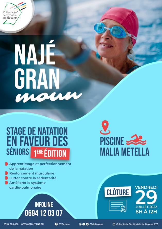 La Collectivité Territoriale de Guyane (CTG) a mis en place tout au long du mois de juillet 2022 un stage de natation en faveur des séniors à la piscine Malia Metella de Cayenne : l’opération « Najé Gran Moun ». Pour clore cette première édition du Najé Gran Moun, une matinée festive est organisée le vendredi 29 juillet 22, de 8h à 12h, à la piscine Malia Metella de Cayenne. La manifestation est ouverte à tous les séniors dès 55 ans.