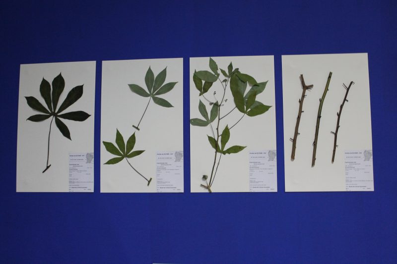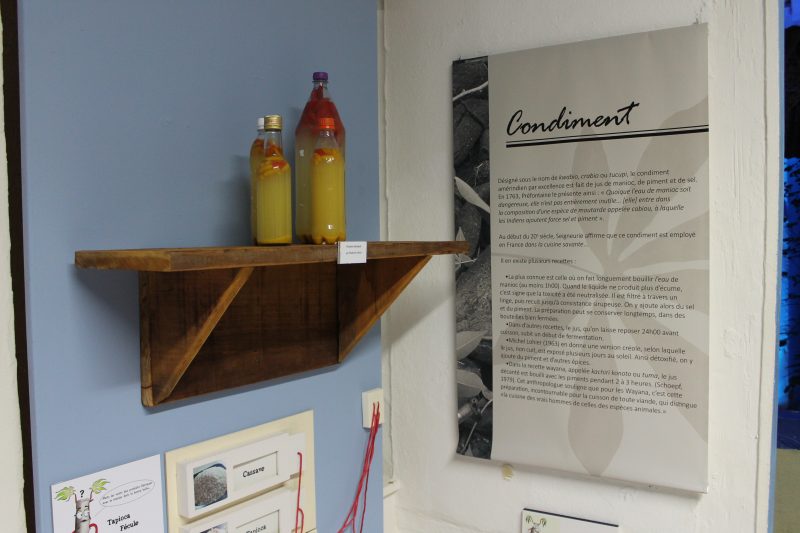 Le parcours débute par une brève description de la plante et un court rappel du contexte historique et agricole guyanais. Suivent les étapes incontournables de la transformation du tubercule des espèces dites amères, qui ne peuvent être consommées in natura et sont les plus utilisées localement. Pour boucler le volet alimentaire, les produits dérivés emblématiques sont présentés. L’exposition se termine par un aperçu des usages non alimentaires et des aspects immatériels liés à la plante.