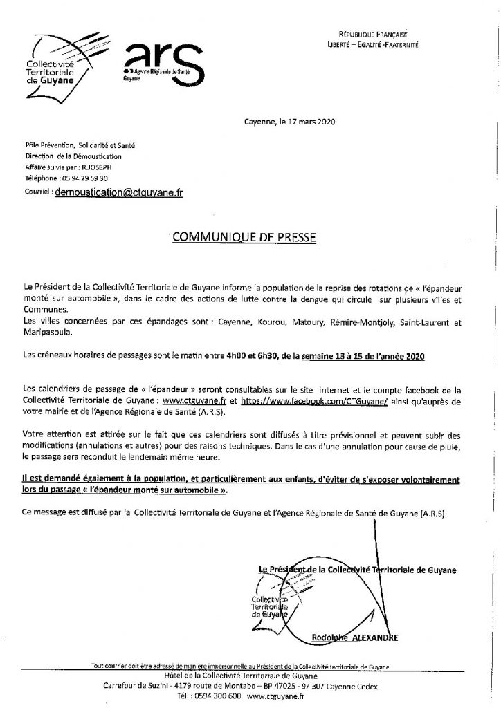 [Mise à jour du vendredi 03 avril 2020] Le Président de la Collectivité Territoriale de Guyane (CTG) informe la population de la reprise des rotations de « l’épandeur monté sur automobile », dans le cadre des actions de lutte contre la dengue sur plusieurs communes.