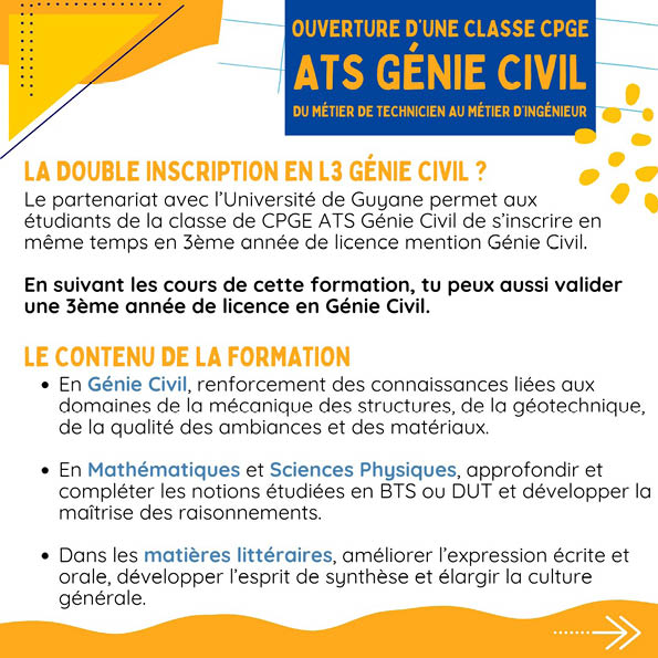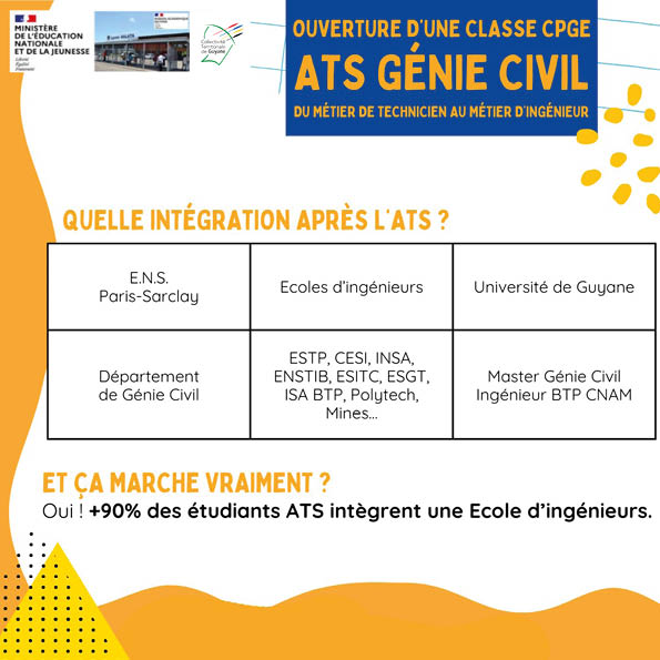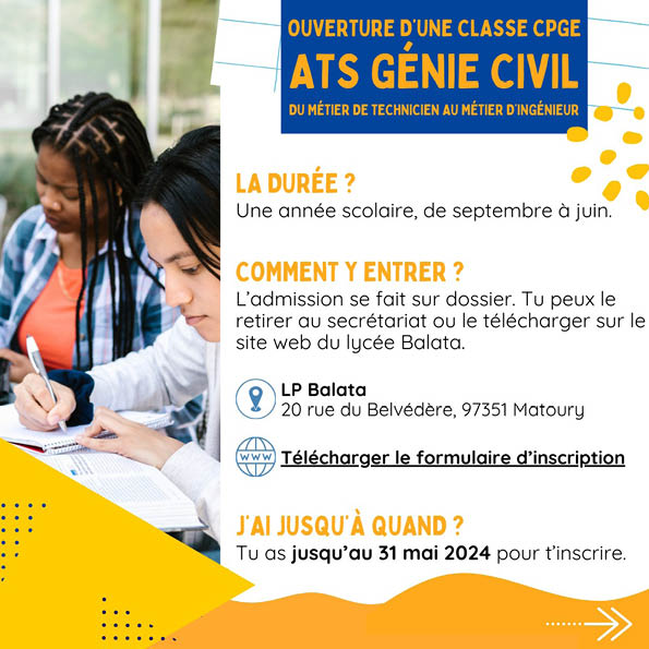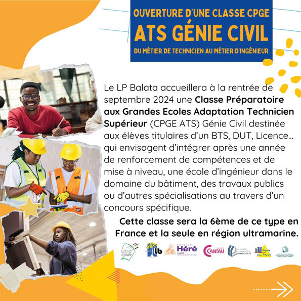 Le Lycée Professionnel de Balata accueillera une Classe Préparatoire aux Grandes Ecoles « Adaptation Technicien Supérieur » Génie Civil du métier de technicien au métier d’ingénieur, dès la rentrée prochaine cette formation.